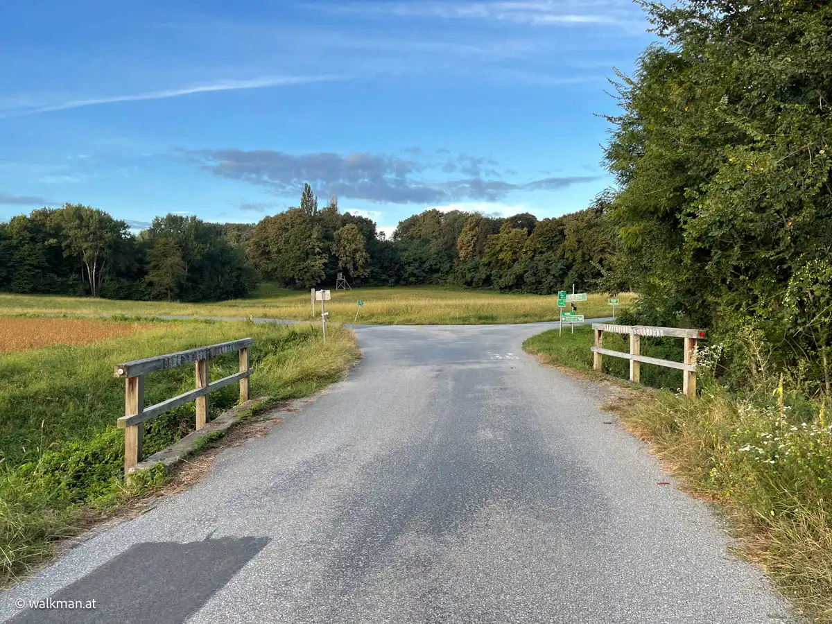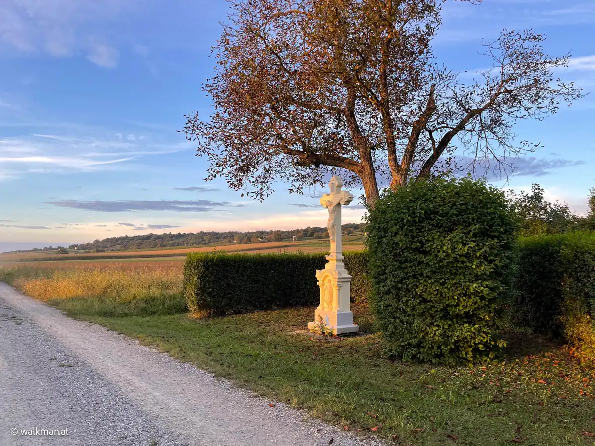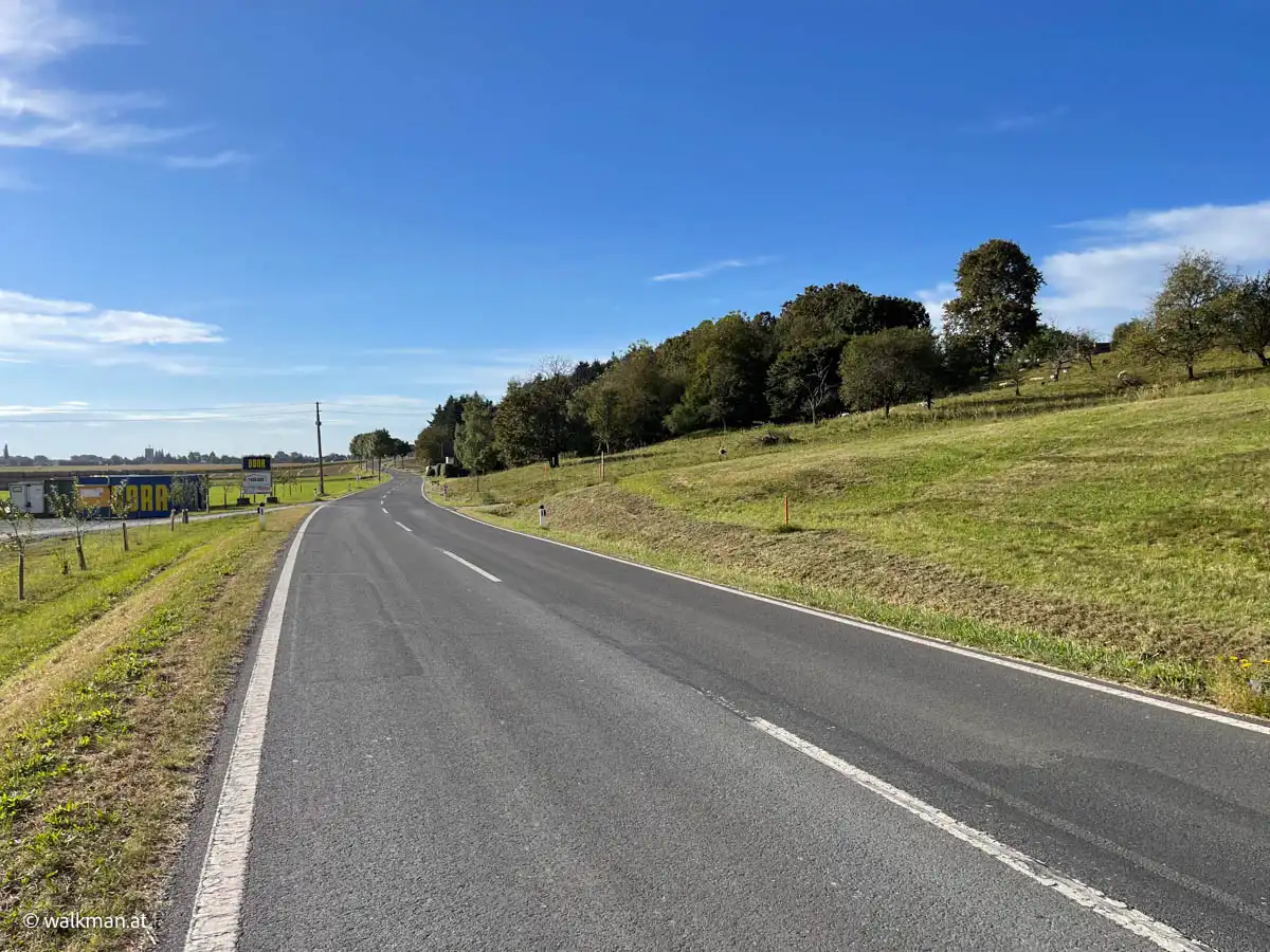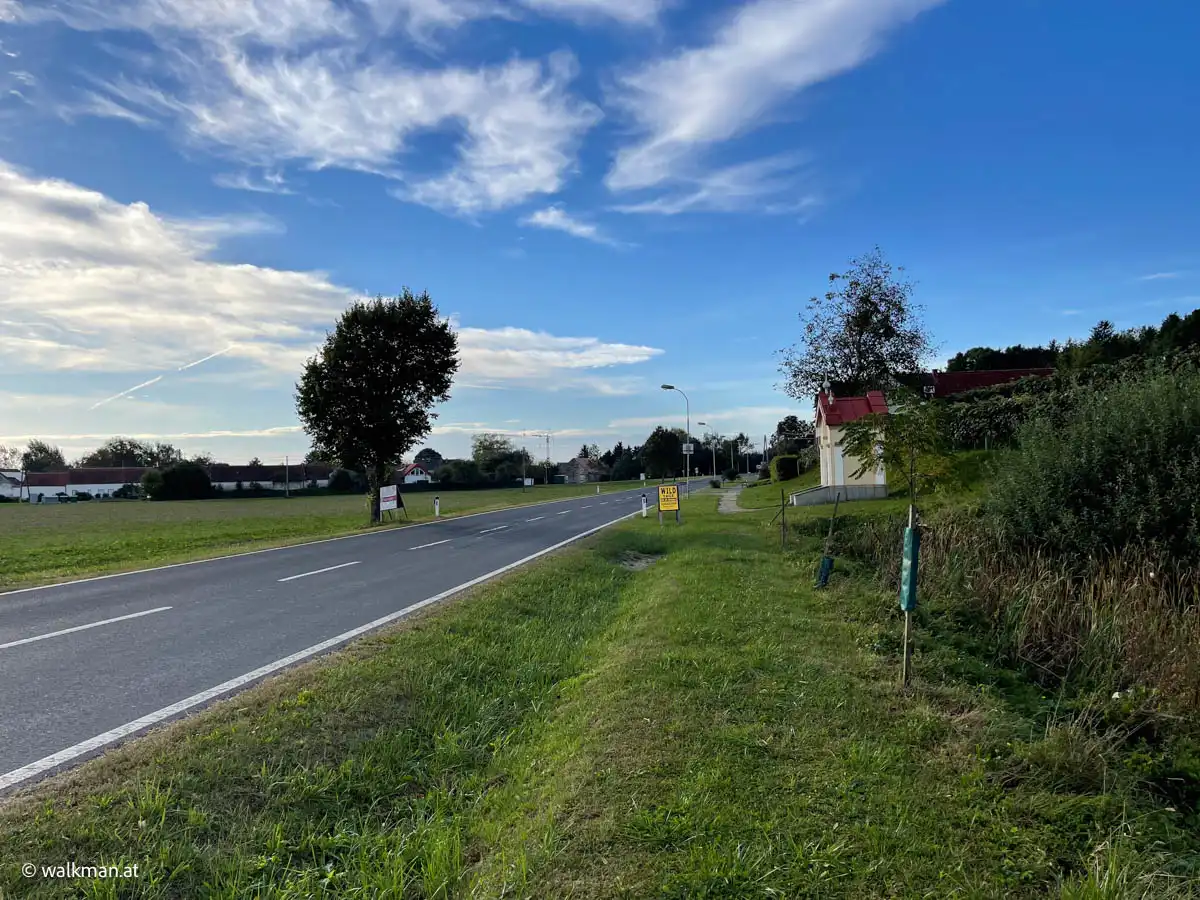 Hier gehts nun etwa zweihundert Meter gerade entlang, bis die Straße eine Rechtskurve beschreibt. An dieser Rechtskurve, bzw. Kreuzung steht, gleich hinter der Brücke Richtung Eberau, auch ein Amerikanerkreuz. Wer gucken mag. Das habe ich allerdings bereits bei einer anderen Tour begutachtet. Deswegen folge ich heute ohne Pause dem Straßenverlauf nach rechts. Ab hier geht es nun langsam bergauf zum Weinberg.