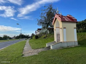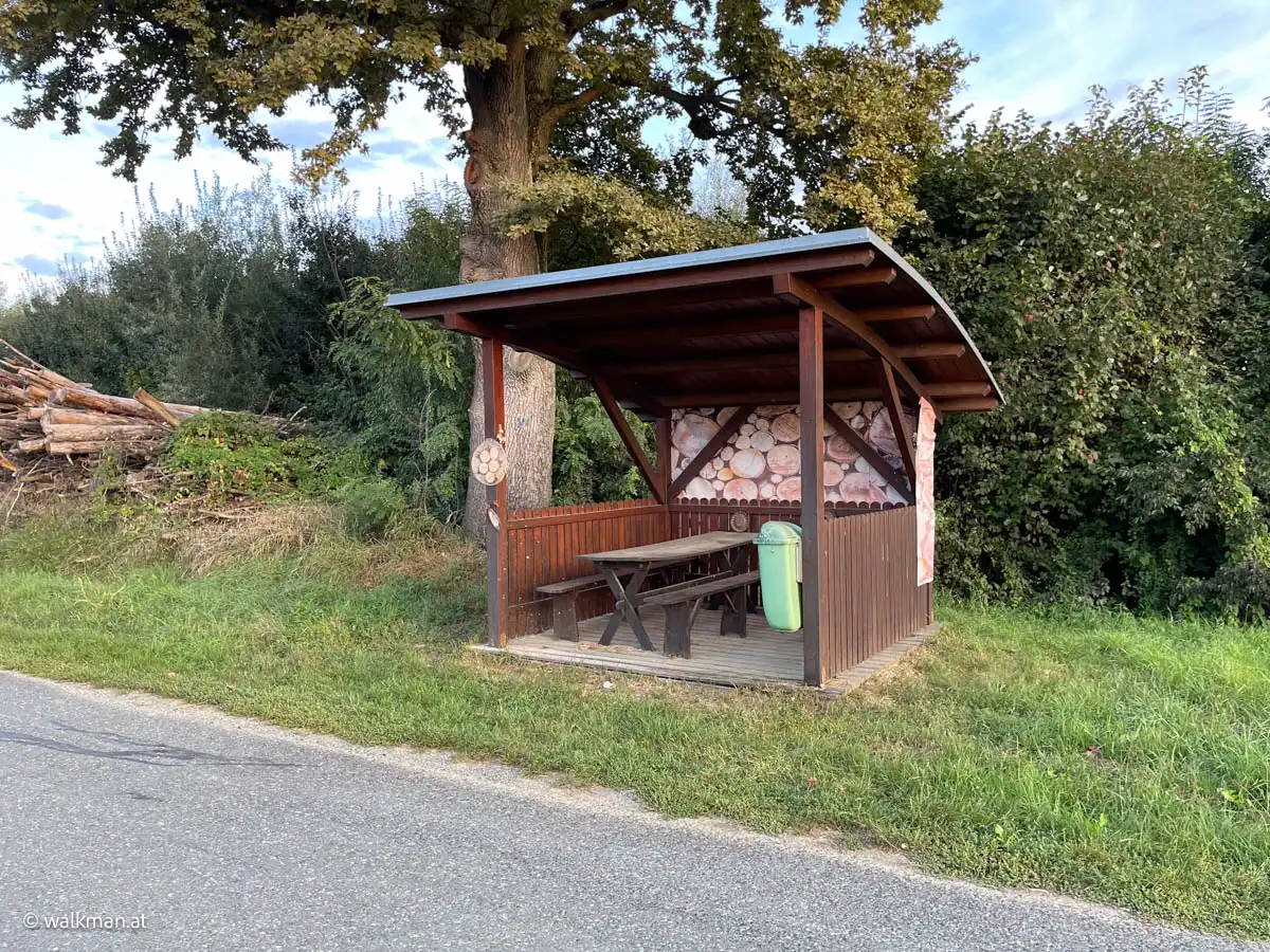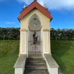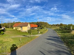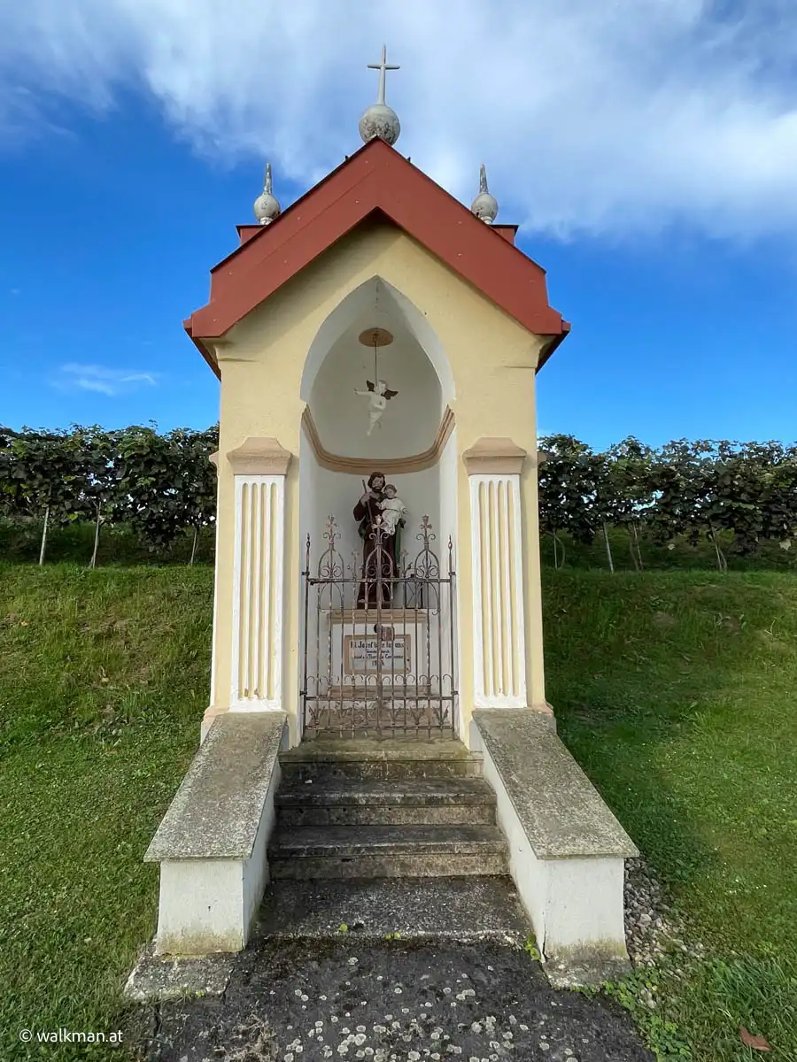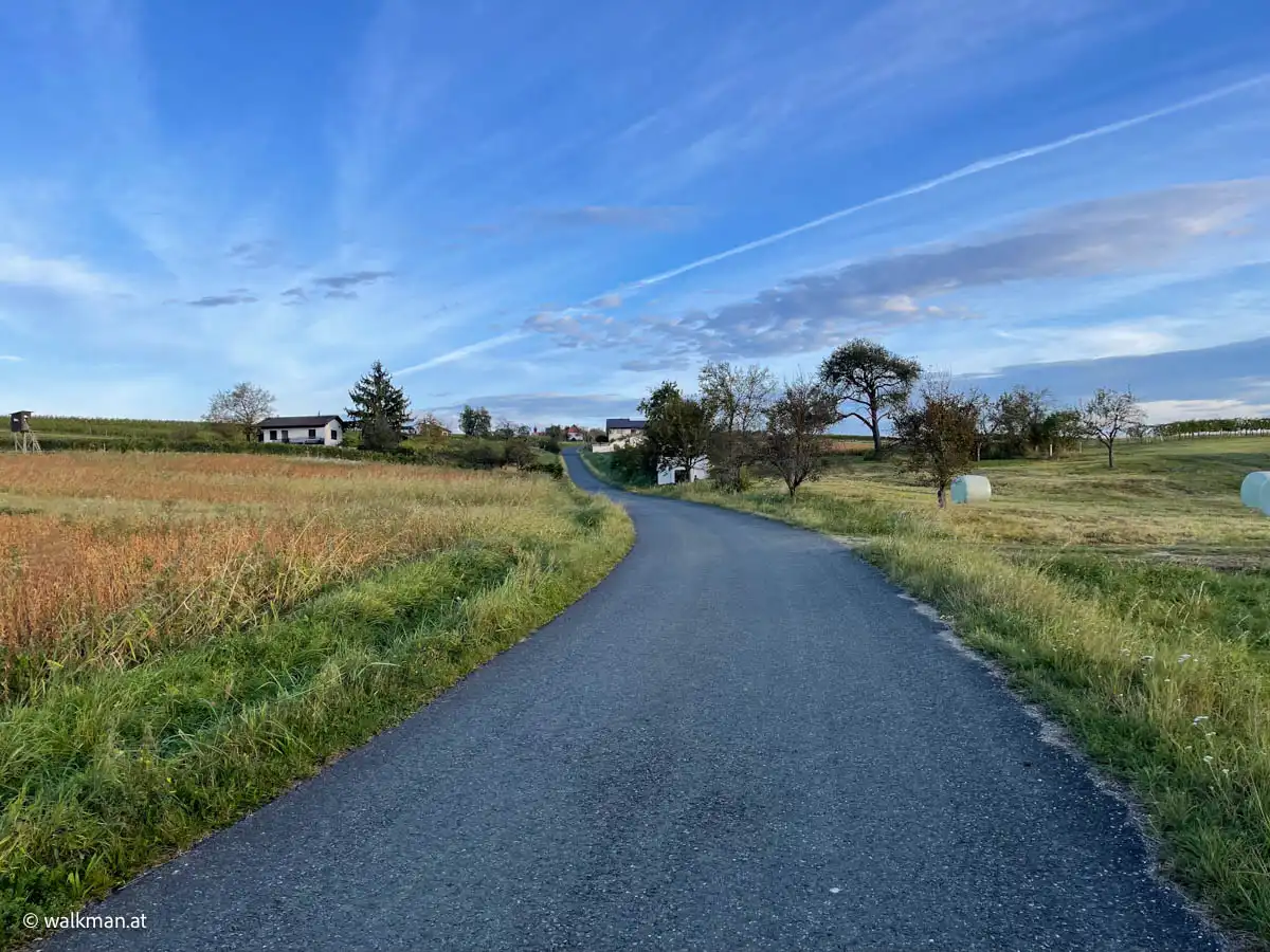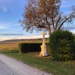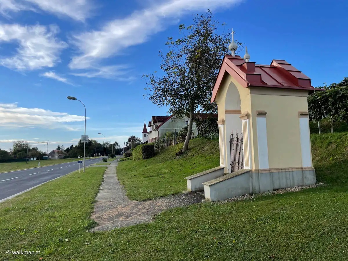 Hier gehts nun etwa zweihundert Meter gerade entlang, bis die Straße eine Rechtskurve beschreibt. An dieser Rechtskurve, bzw. Kreuzung steht, gleich hinter der Brücke Richtung Eberau, auch ein Amerikanerkreuz. Wer gucken mag. Das habe ich allerdings bereits bei einer anderen Tour begutachtet. Deswegen folge ich heute ohne Pause dem Straßenverlauf nach rechts. Ab hier geht es nun langsam bergauf zum Weinberg.
