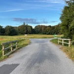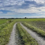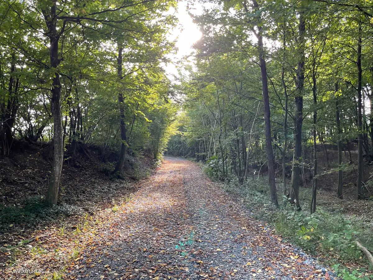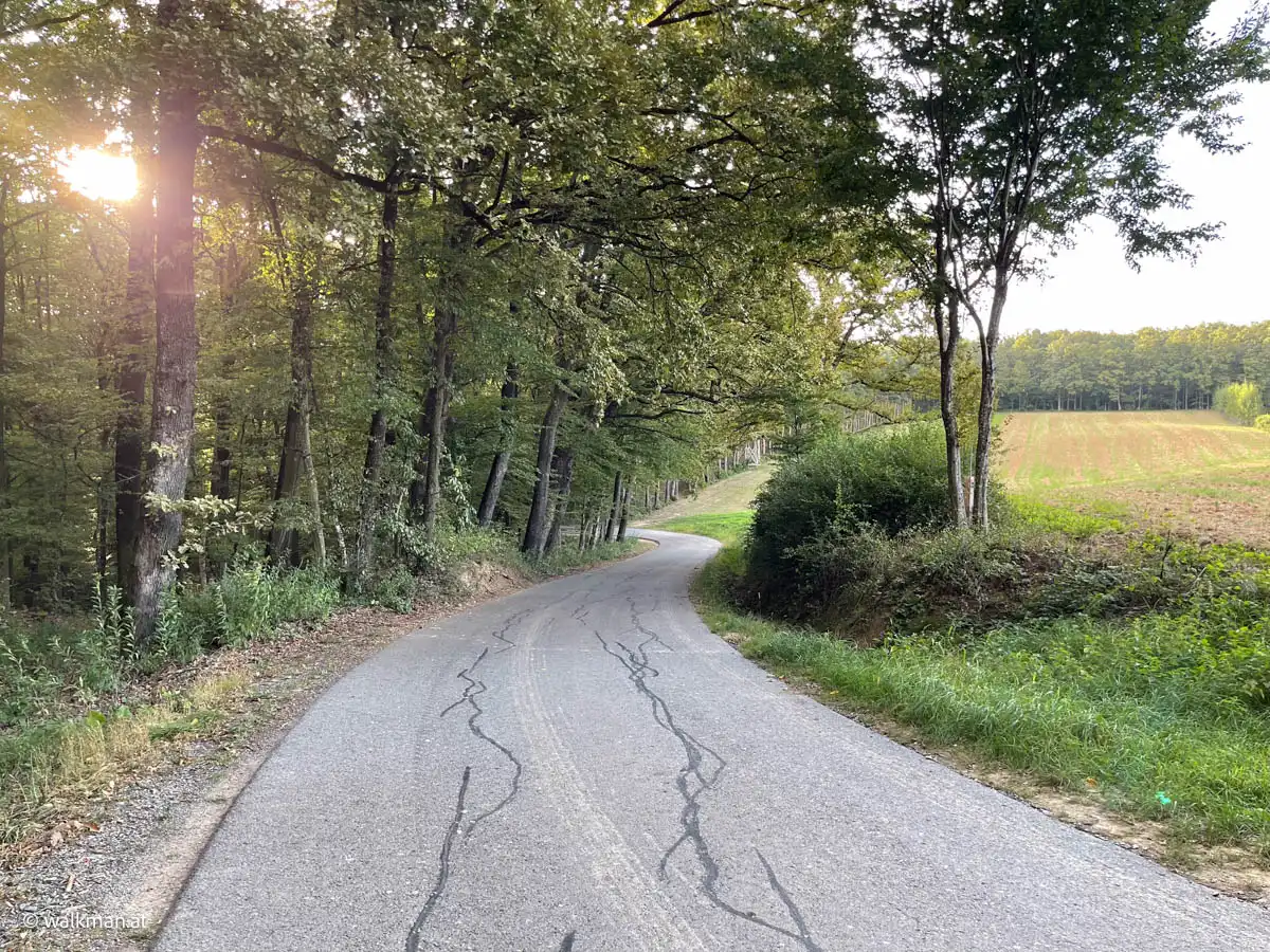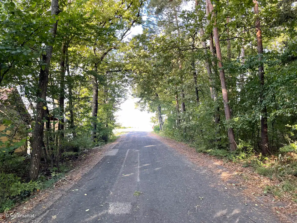 Hier muss ich nun aufpassen. Einer der Wege, die links von der Straße wegführen, ist der Richtige. Und natürlich erwische ich zunächst den Falschen. Aber ein weiterer Blick auf den Punkt am Handy sagt mir: Der nächste Weg ist es, auf dem die Route hier von der Straße weg, links einbiegt. Und den marschiere ich nun rein.