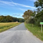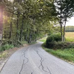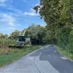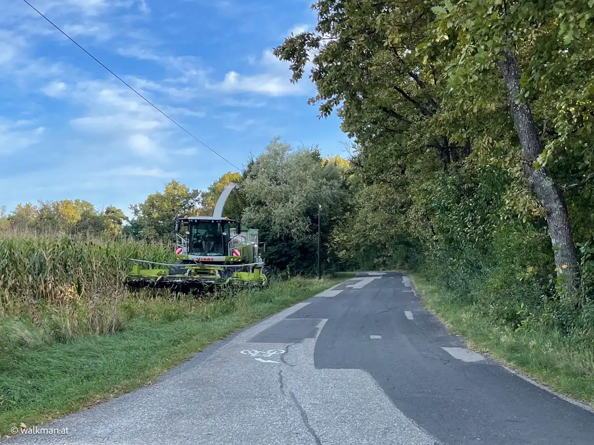 Nach einer Linkskurve geht es hier nun in ein Waldstück hinein. Von irgendwo her vernehme ich Lärm, den ich nicht einordnen kann. Und der scheint gar nicht so weit weg zu sein. Ah, ein Mähdrescher. Schon nach der nächsten Biegung hat sich das Rätsel gelöst. Ein Drescher und mehrere Traktoren sind hier bereits fleißig mit der Mais-Ernte beschäftigt.