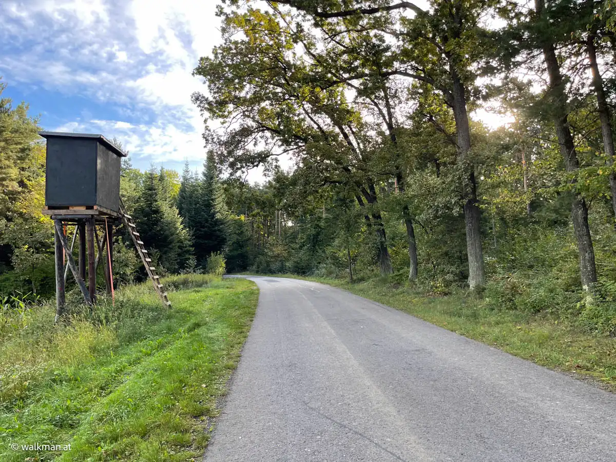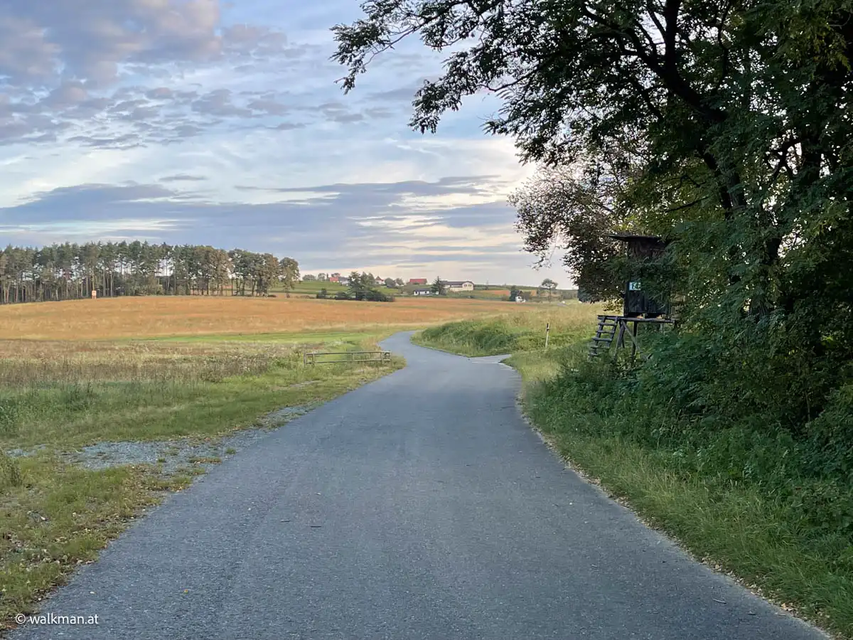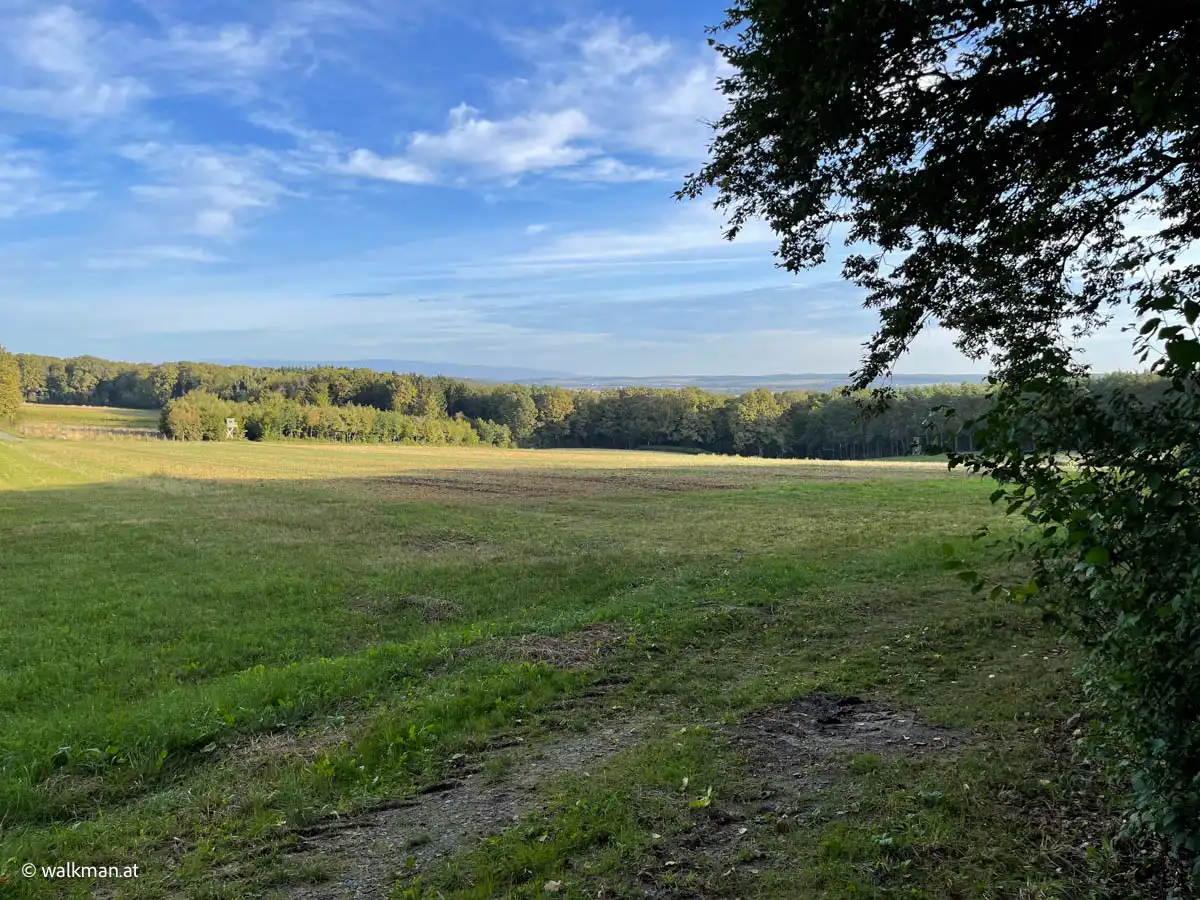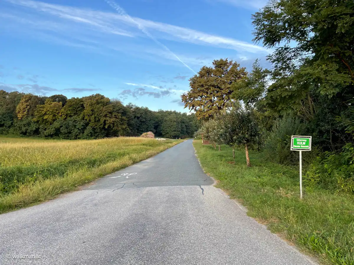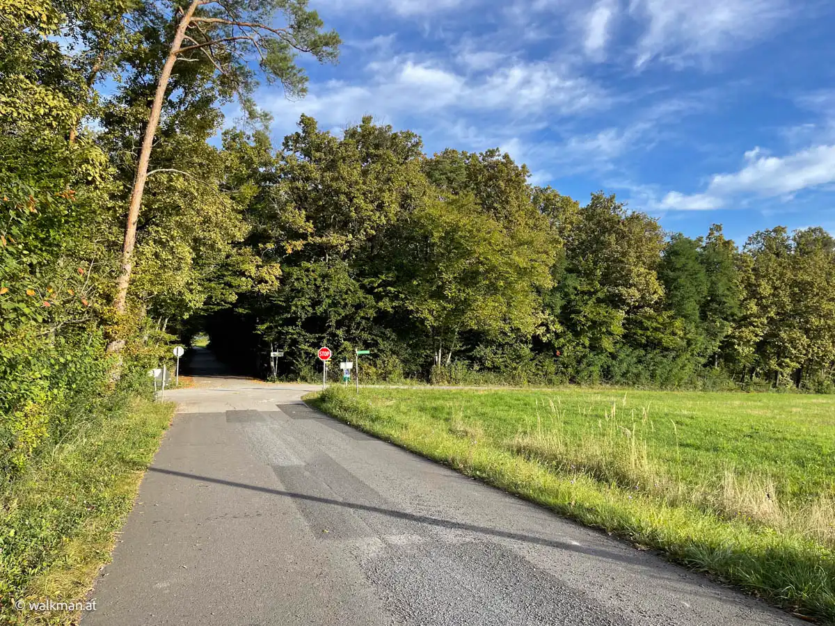 Bei mir gehts aber natürlich weiter. Mittlerweile bin aus dem Waldstück wieder heraußen und wandere bergab, die Routenführung weiter. An der nächsten Kreuzung, in der Nähe von „Edlitz-Bergen“, halte ich mich rechts. Weiterhin bergab, nach Osten folgt nun ein zweites, kurzes Waldstück, an dessen Ende das Pinkatal auf mich wartet.