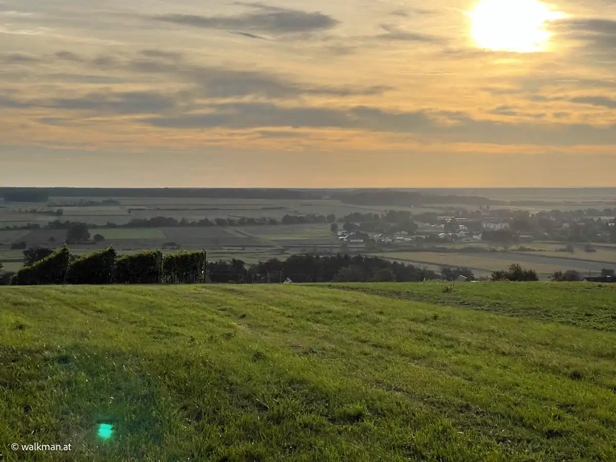 Bei einigen Schlucken aus meiner Trinkflasche lasse ich meinen Blick über das Tal unter mir schweifen. Vom Geschriebenstein im Norden, über Ungarn und die pannonische Tiefebene im Osten, bis weit nach Süden, das Pinkatal hinab. Mit der weiterhin aufgehenden Sonne im Hintergrund. Traumhaft.