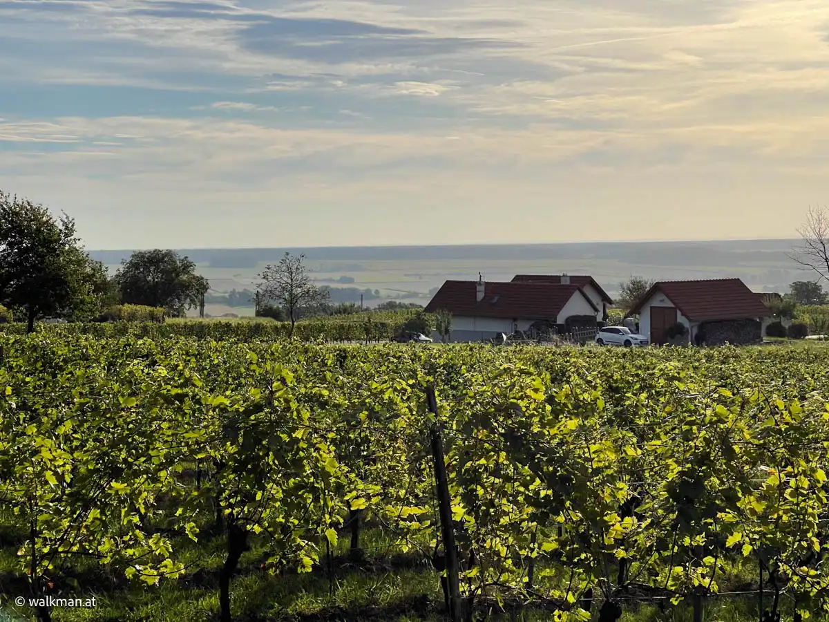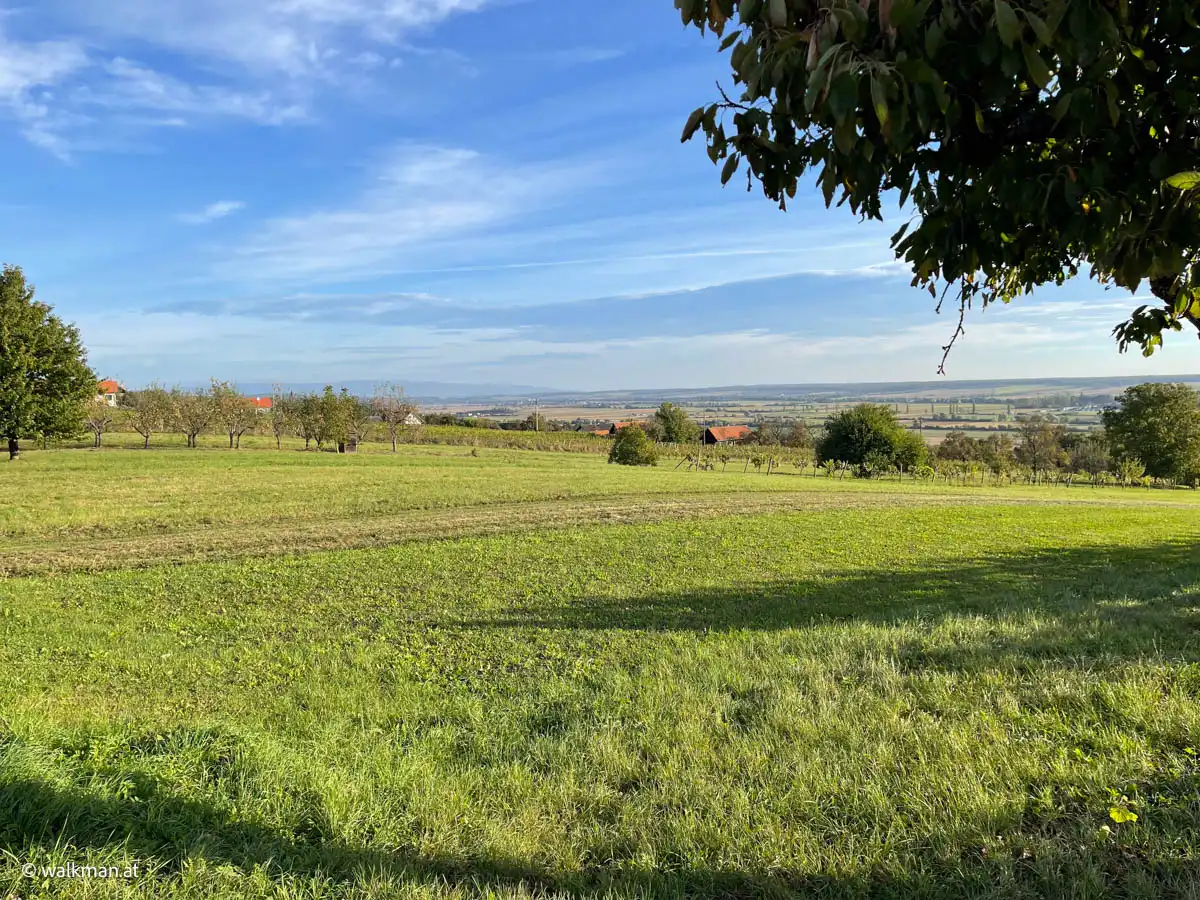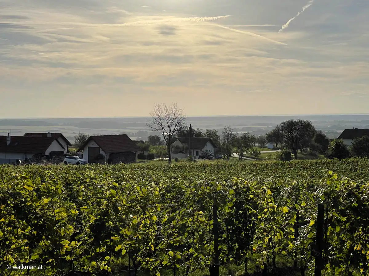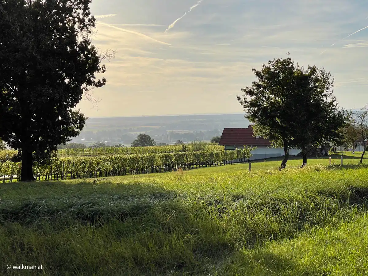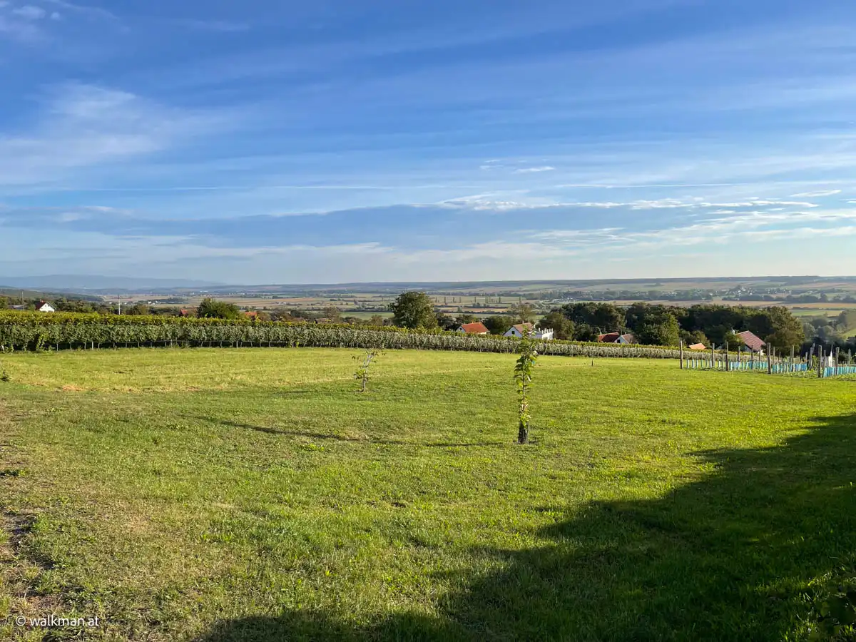 Ein Stück weit führt die Strecke hier noch bergauf. Am Ende der Tour wird meine Uhr insgesamt 88 Höhenmeter anzeigen. Weiter zwischen Kellerstöckeln, Weingärten und Obstbäumen wandernd. Und auch weiterhin mit tollen Ausblick nach Osten.