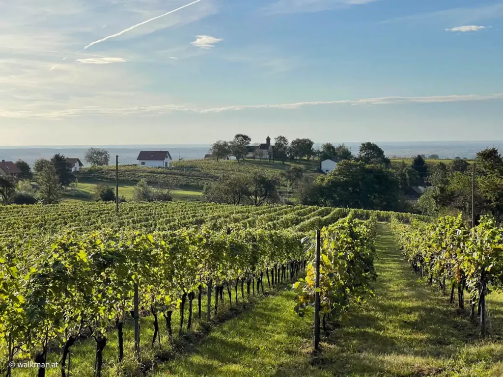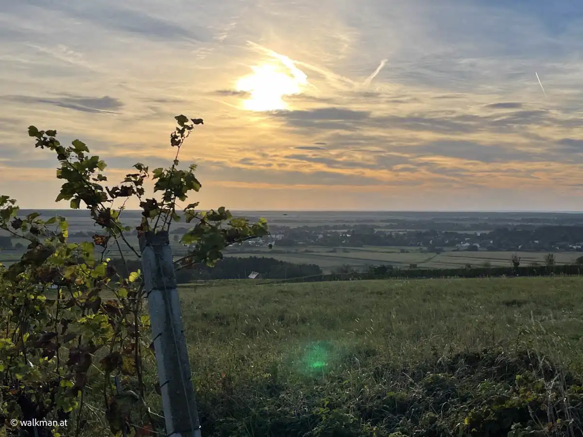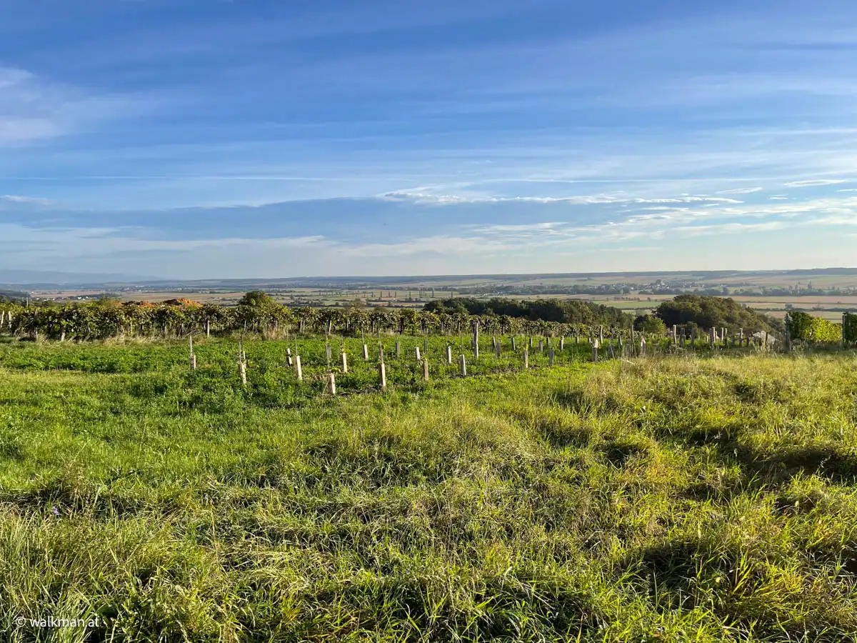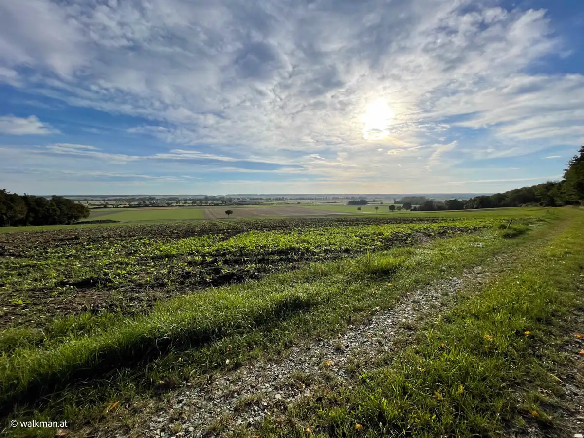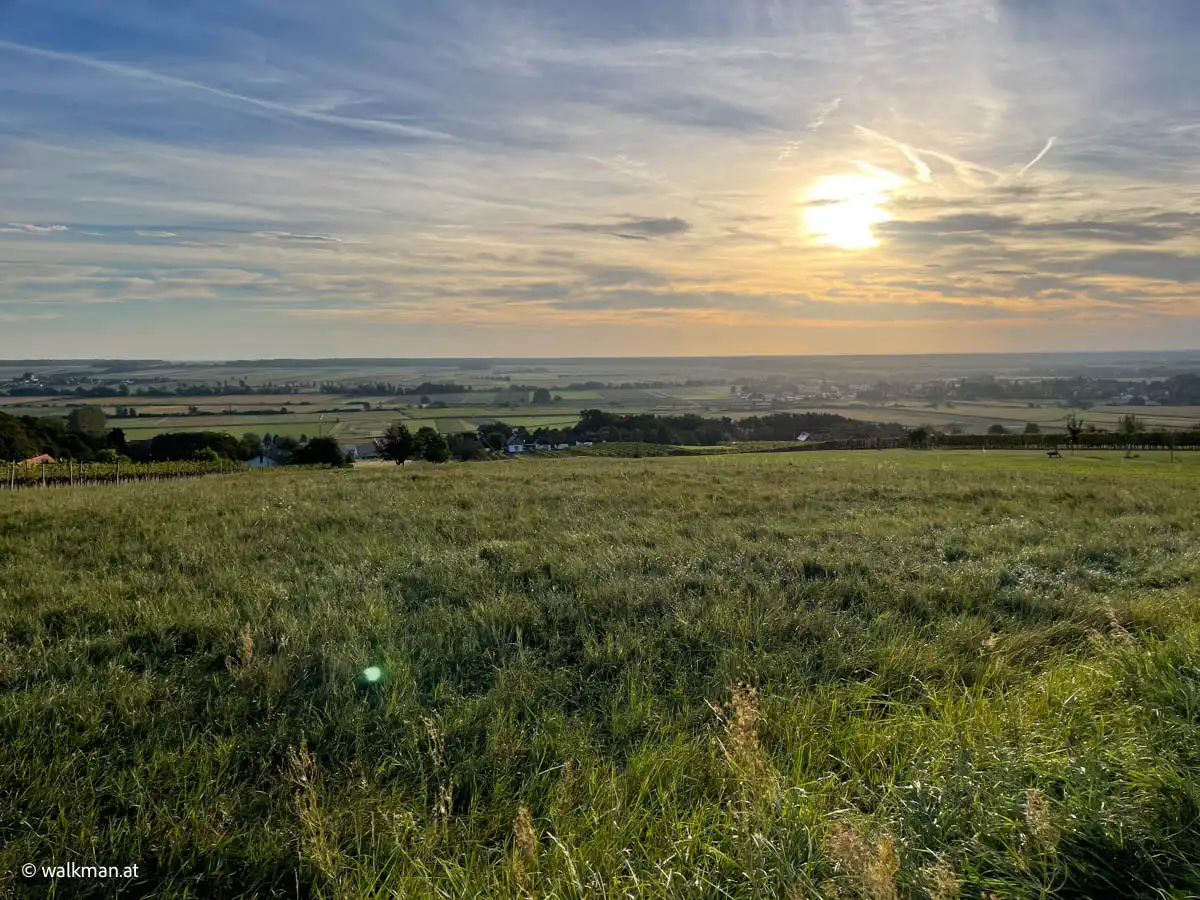 Ein Stück weit führt die Strecke hier noch bergauf. Am Ende der Tour wird meine Uhr insgesamt 88 Höhenmeter anzeigen. Weiter zwischen Kellerstöckeln, Weingärten und Obstbäumen wandernd. Und auch weiterhin mit tollen Ausblick nach Osten.