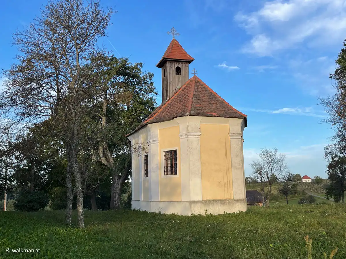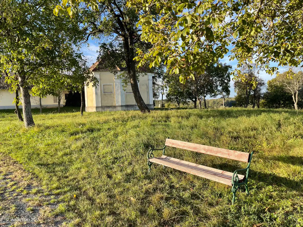 Was sich am Weg zum Gipfel bereits angekündigt hat, ist ganz oben dann natürlich noch viel schöner. Hier wartet mein zweites, diesmal Geplantes, Highlight auf mich: die Bergkapelle. Ein altes sakrales Bauwerk, das man vom Tal unten schön sehen kann. Und gleich daneben eine Bank, die mich zu einer Rast einlädt. Und diesmal nehme ich diese Einladung dankbar an.