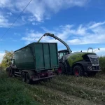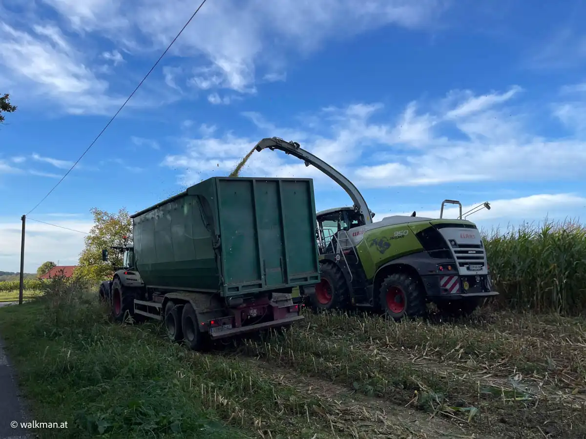 Die Silage wird’s gleich direkt auf die parallel fahrenden Hänger gehäckselt. Das kenne ich noch von früher. Bin ja selber auch auf einem Bauernhof aufgewachsen. Das ist ja mittlerweile eine richtig nostalgische Tour, denke ich schmunzelnd. Die Vergangenheit holt einen ja doch immer wieder ein.