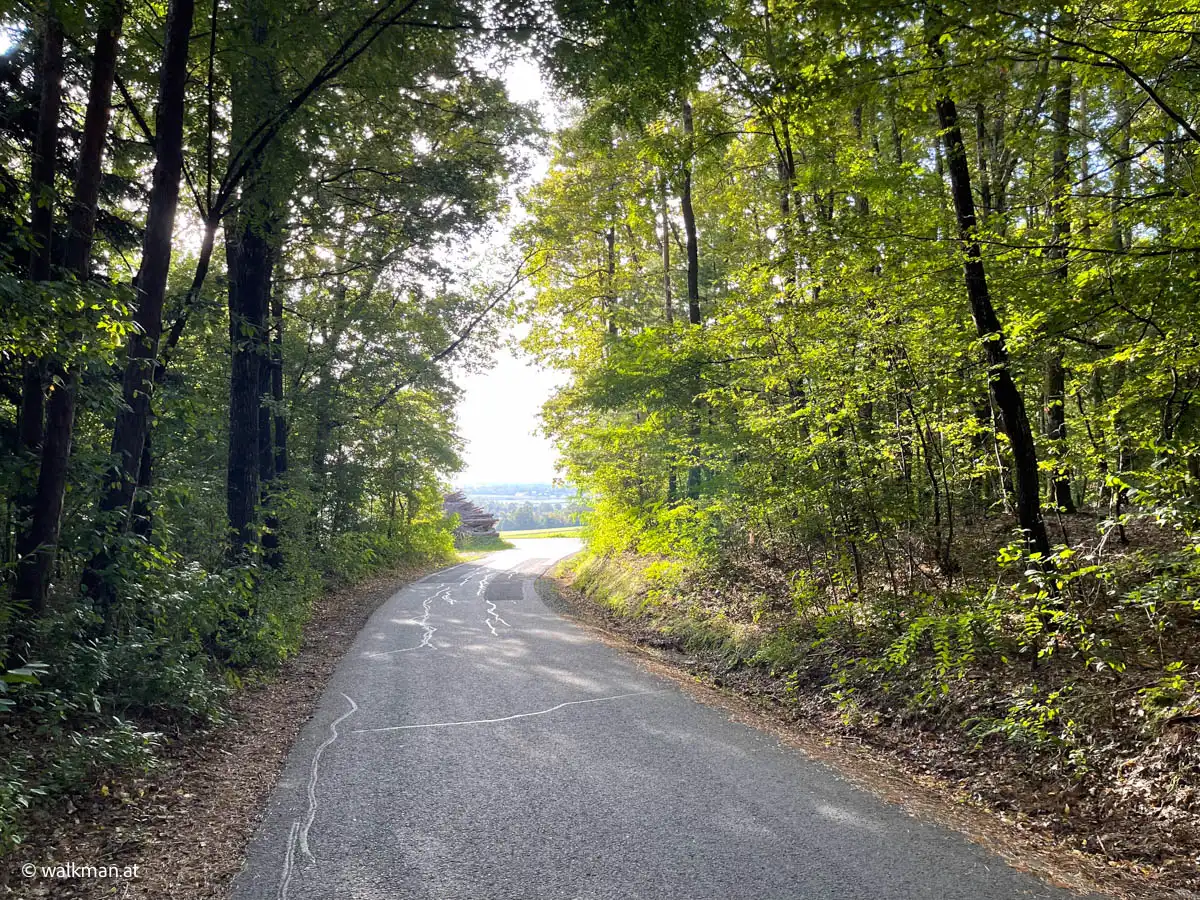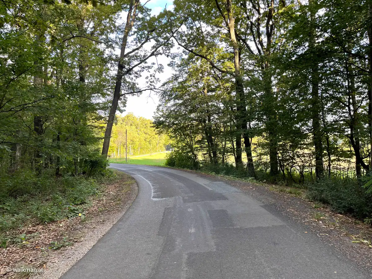 Was zunächst unmerklich und dann angenehm begonnen hatte, wechselt nun zu ansprechend und weiterfolgend zu herausfordernd. Am Höhenprofil der Tour kann man hier, grob gesagt, eine teils exponentielle Kurve nach oben erkennen. Mit „Steigungsspitzen“ von etwa neun bis zwölf Prozent. Auf ungefähr zwei Kilometer verteilt. Meine Wandeln brennen jedenfalls zunehmend und die Pausen, in Form von kurzem Atem holen, die ich hier einlege, sind nicht immer nur für Fotos.