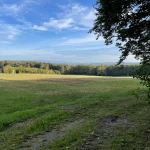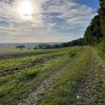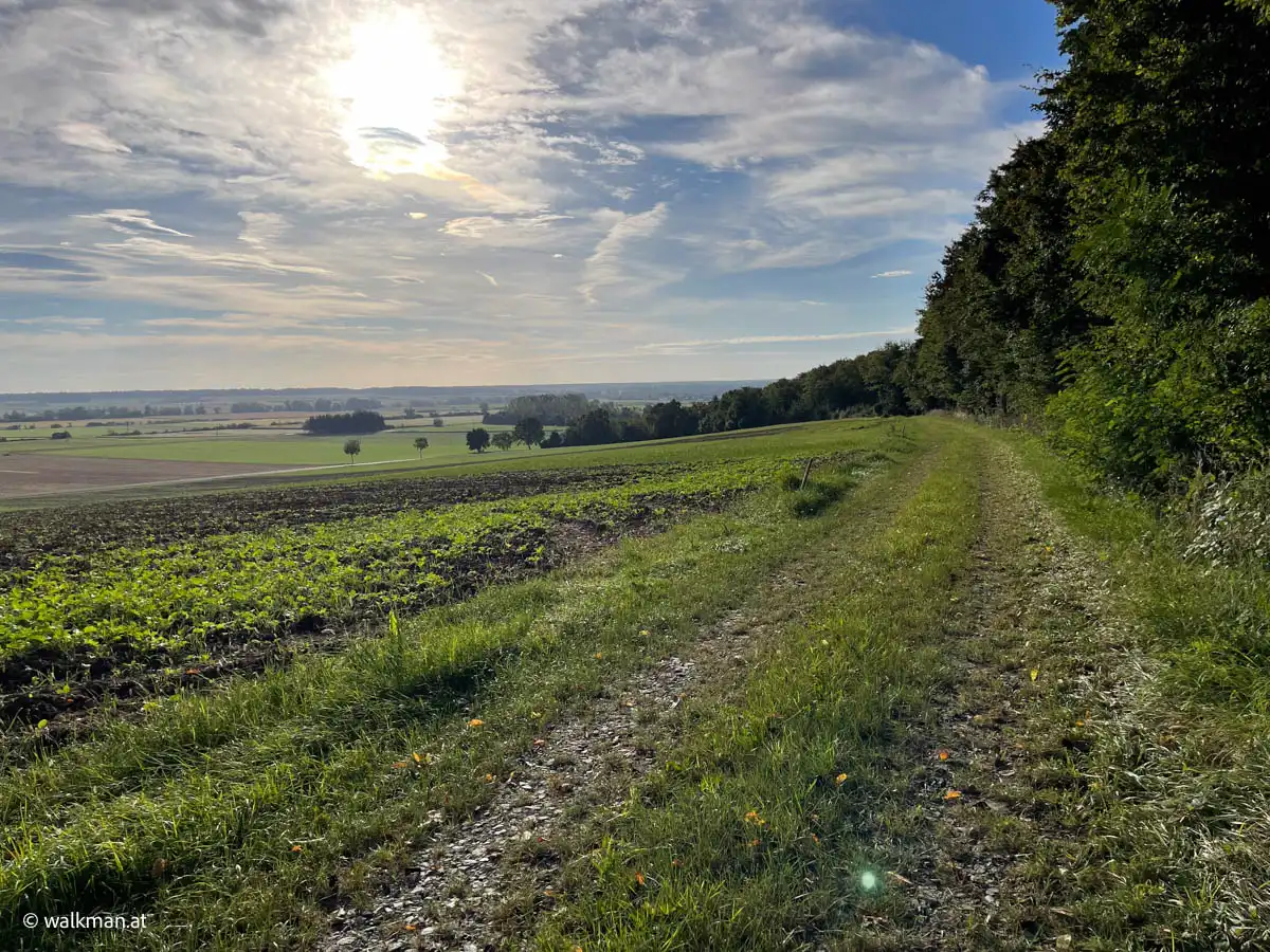 Aus dem Wald hinaus kann ich dann auch schon das Pinkatal erkennen und ein wenig weiter unten die Bundesstraße, die sich hier von Nord nach Süd schlängelt. Nun noch ein Stück am Waldrand entlang. Hier verläuft meine gewählte Route nun auf einem Feldweg schräg hinunter zur Straße.