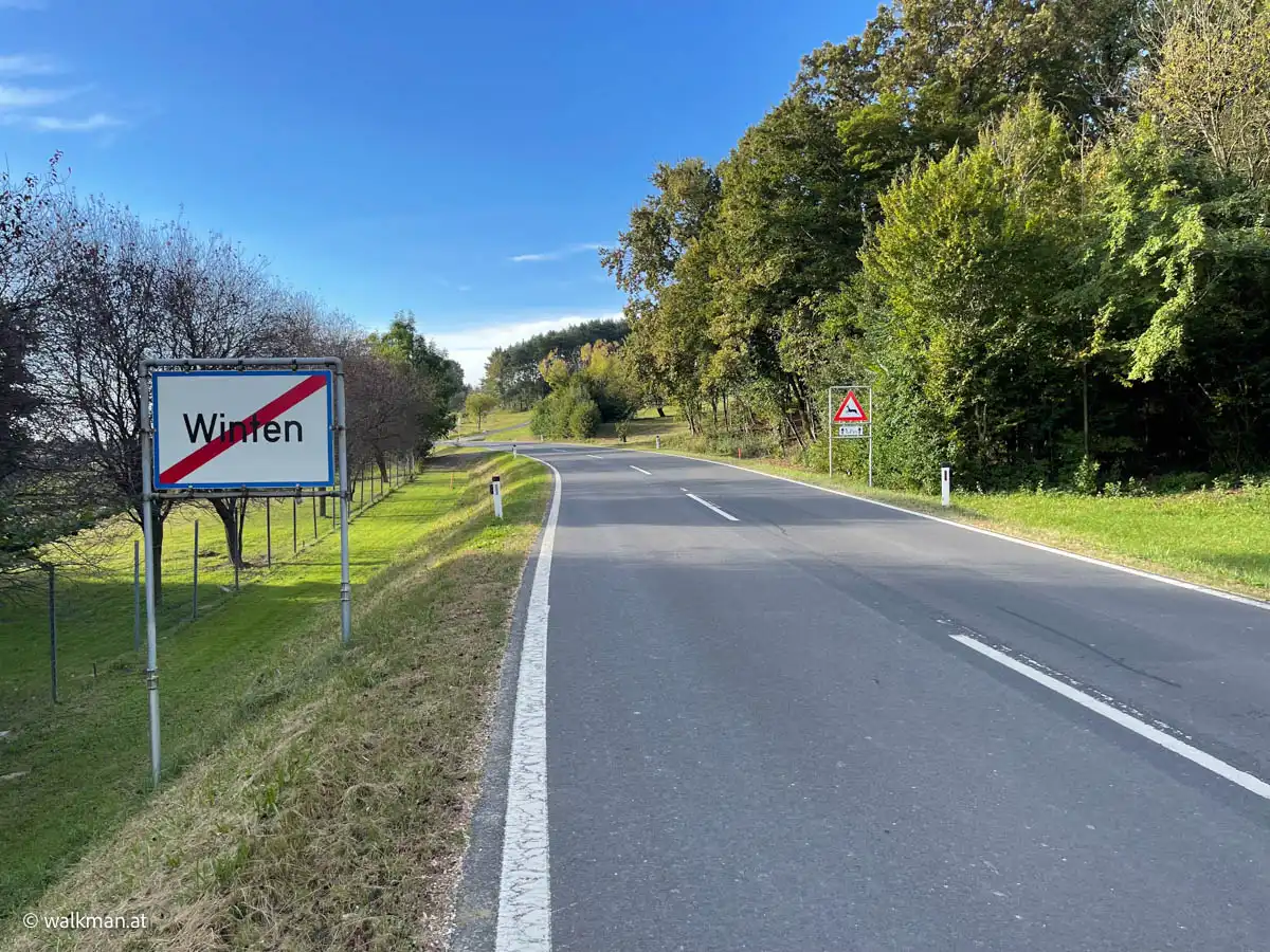 „Winten“, das Ortsschild begrüßt mich, als ich aus einem nochmaligen, kleinen „Gebüschabschnitt“ (Wald kann man das nicht wirklich nennen hier) in die „Welt der Menschen“ hinaus trete. Straße, Häuser, Verkehr – die Zivilisation hat mich wieder.