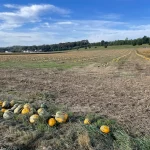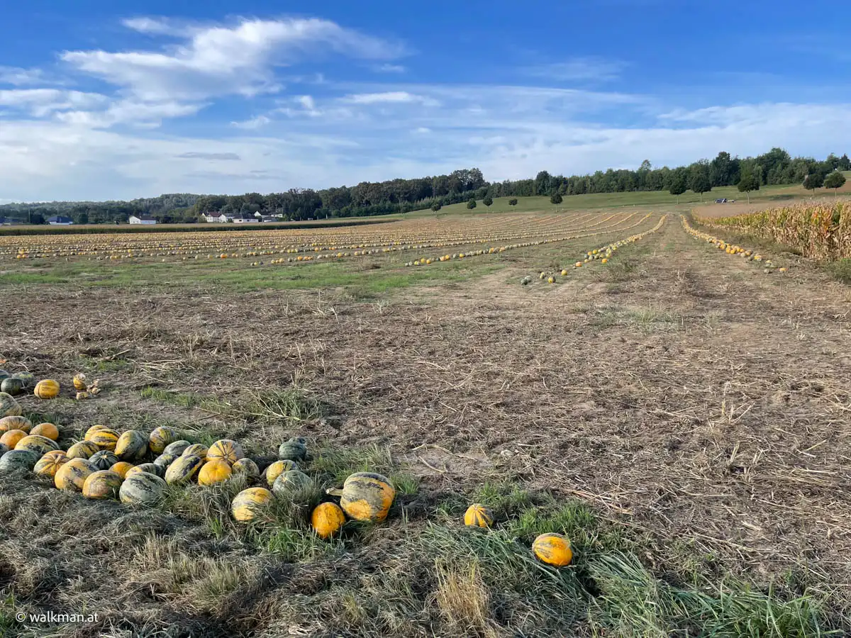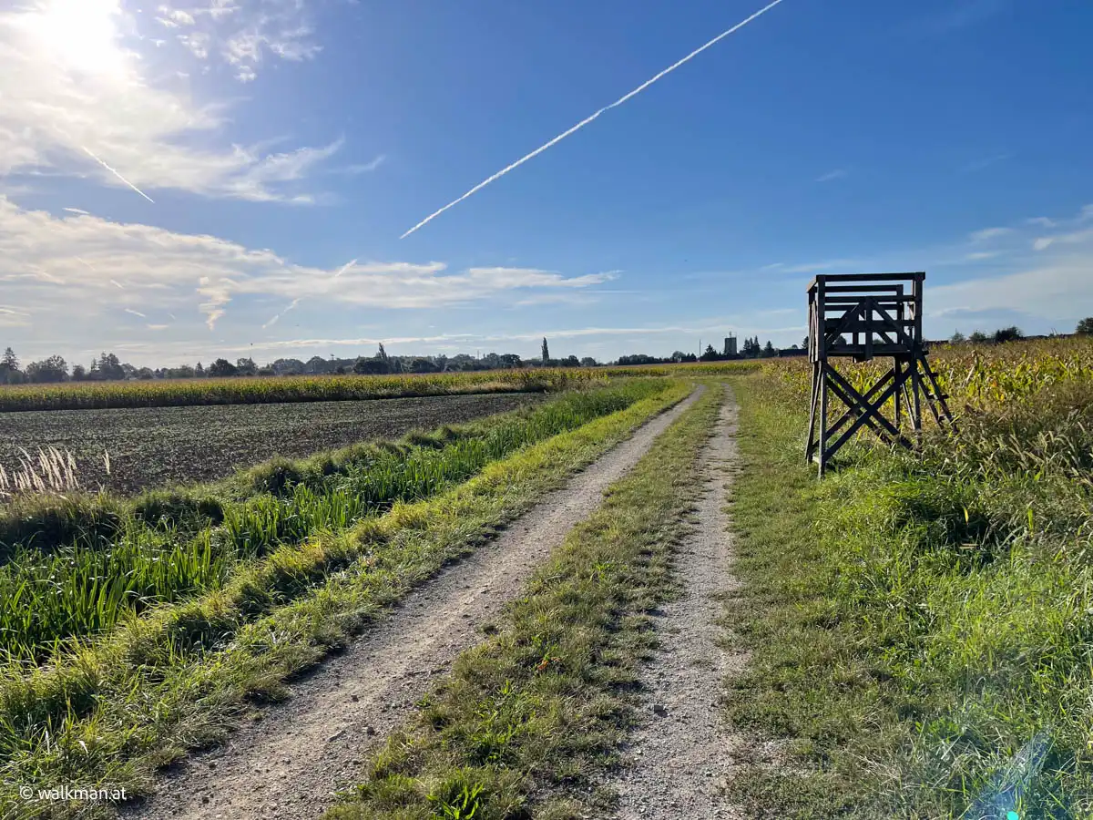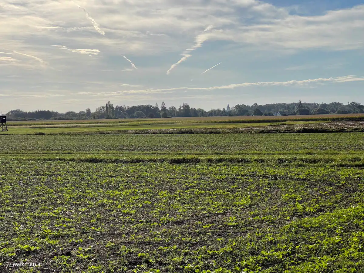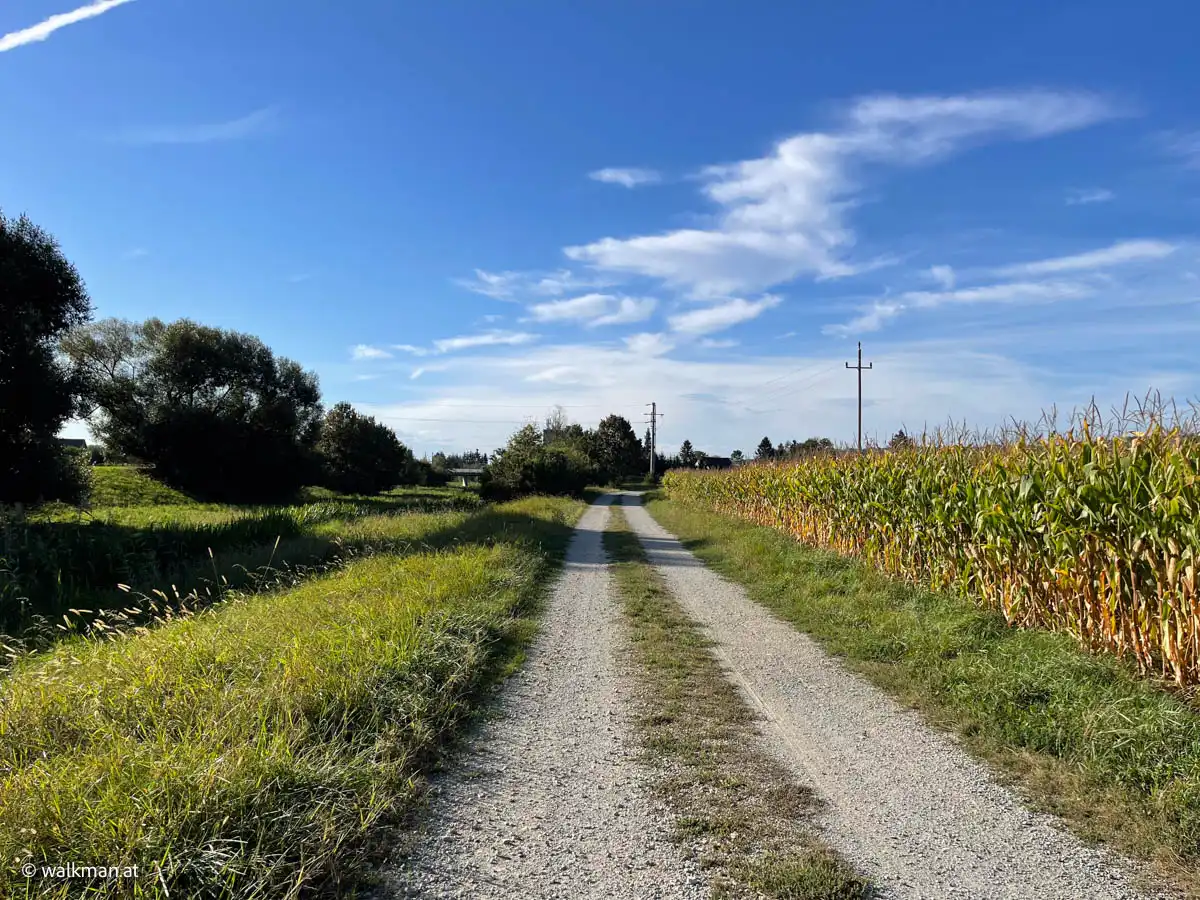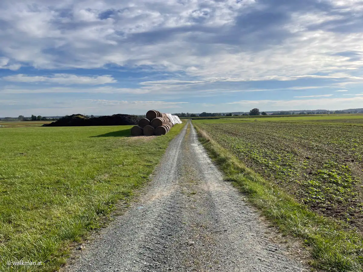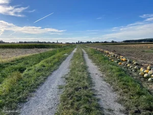 Flach. Sehr flach. Und auch schon die finalen Kilometer dieser Wanderung. Über Feldwege marschiere ich nun Richtung Eberau nach Süden. Vorbei auch an riesigen Kürbisfeldern, wo tausende der Kugeln auf ihren Abtransport und Weiterverarbeitung warten. Aus vielen wird sicher das gute, nussige Kürbiskernöl gepresst.