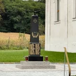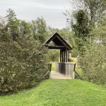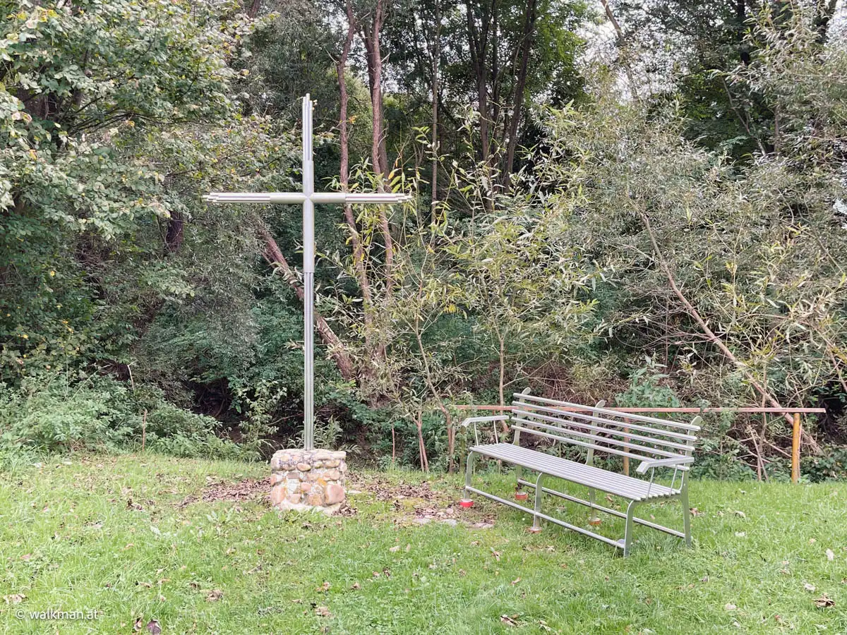 Kurze Zeit später überquere ich die Brücke über die Lafnitz und sehe bereits Rohrbrunn vor mir. Gleich nach der Brücke, zur rechten Hand, findet man hier auch einen stylischen Rastplatz. Das Kreuz und die Bank aufeinander abgestimmt, aus demselben Material. Vermutlich Edelstahl. Oder Aluminium? Auf jeden Fall ist beides aus glänzendem silbernem Metall gefertigt.