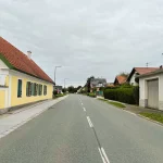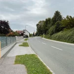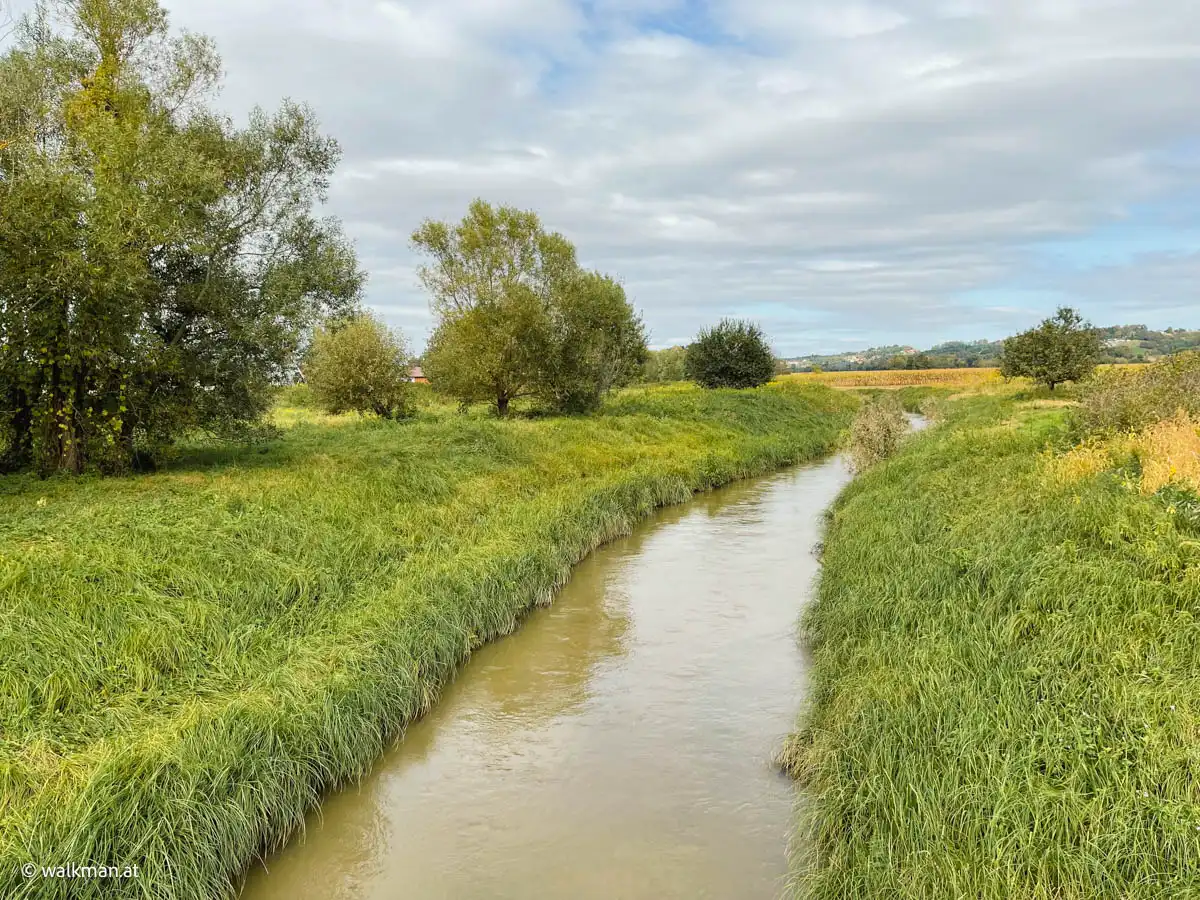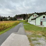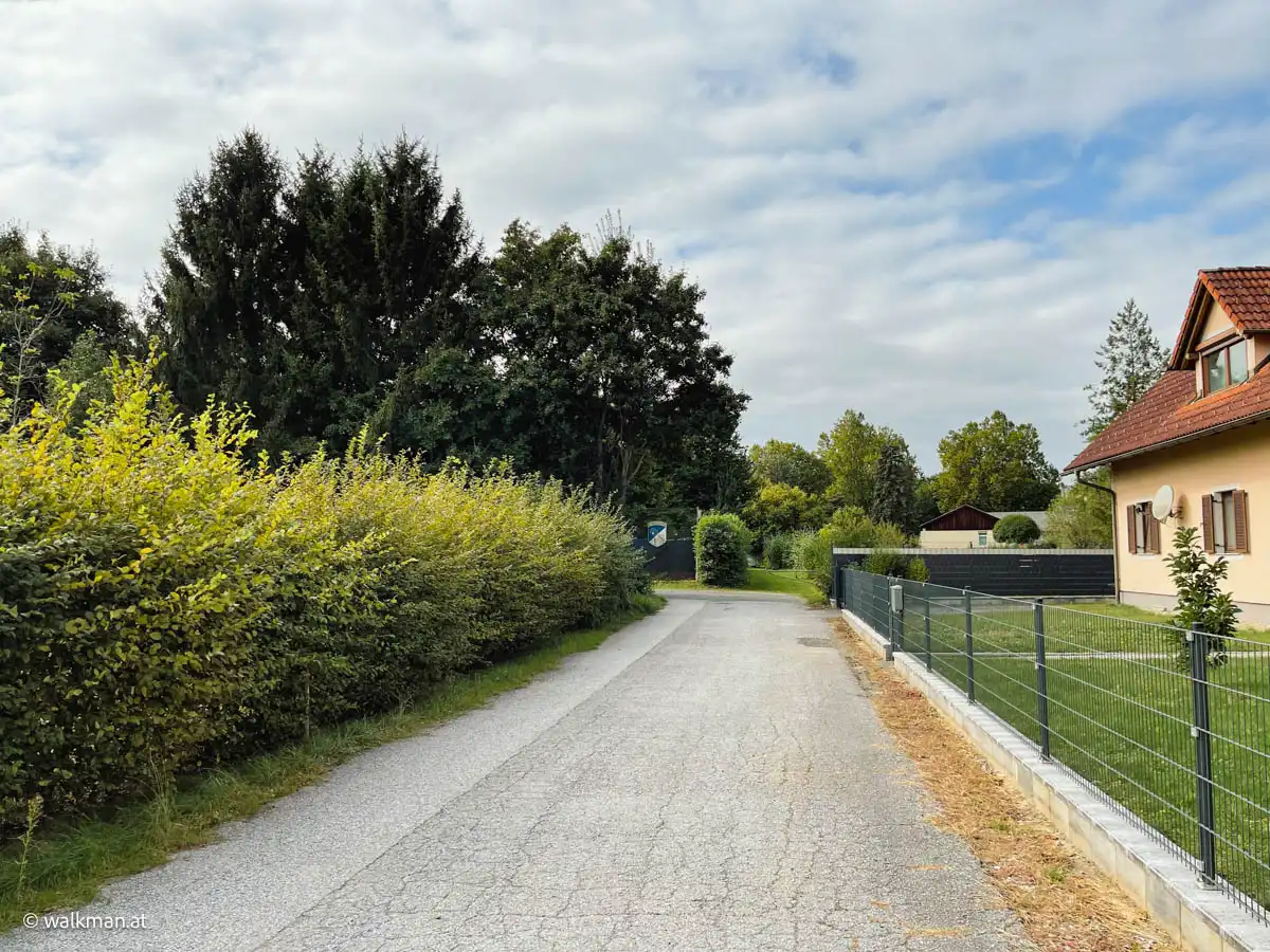 Nun geht es die Straße, die Richtung weiterführend, wie wir gekommen waren, weiter. Nach Süden. Richtung Fürstenfeld. Um dann bei der 90° Rechtskurve, nach links, in die Gasse hinein, abzubiegen. Entlang des Lobenbachs, der hier links der Route fließt, walke ich aus Burgau hinaus.