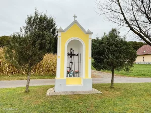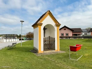 Auf etwa halber Strecke übers Land in den nächsten Ort finden wir ein erstes Highlight: eine kleine Kapelle am Straßenrand. Besser gesagt ein Bildstock. Ich werde mir den Unterschied wohl nie merken. Sagen wir einfach „Marterl“ dazu. Das gilt für beide. Wirkt aber schön gehegt und gepflegt. Flink ein paar Fotos gemacht und schon gehts weiter.