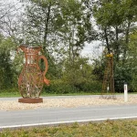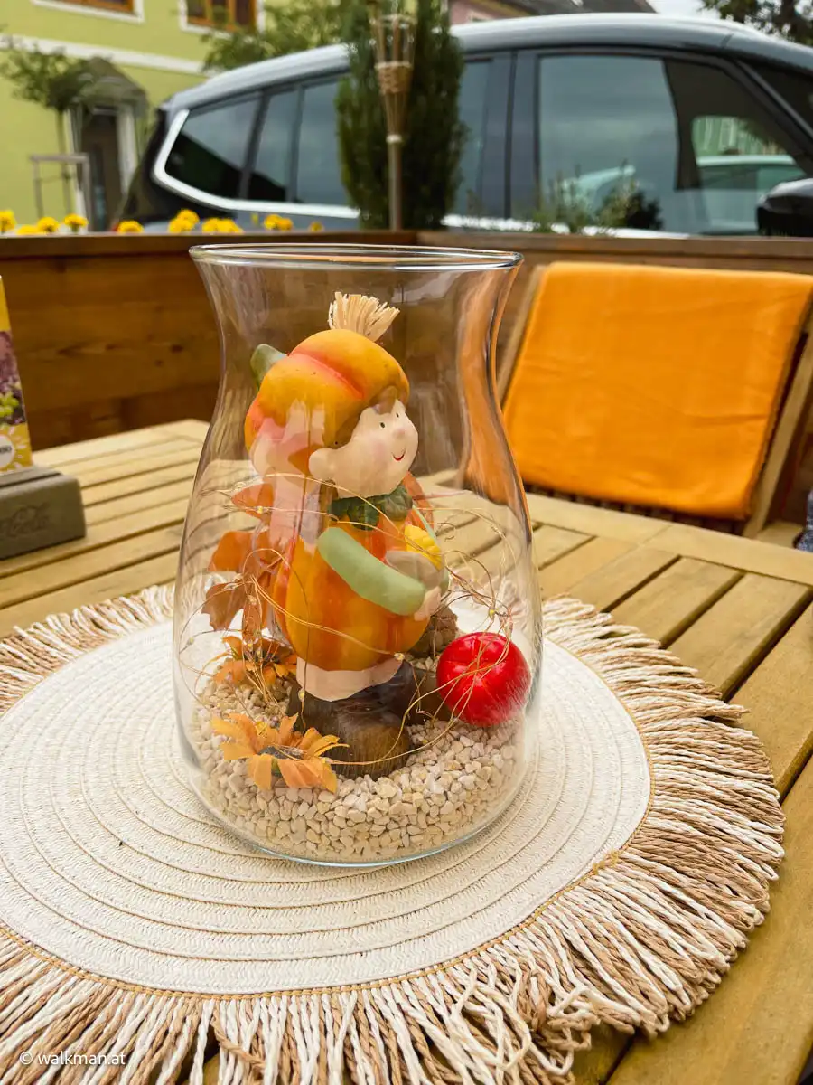 Ich kann mich an eine Wanderung zur Adventzeit erinnern, als hier ein grosser Kranz mit Kerzen installiert war. Und rundum Weihnachtsdeko. Hat mir richtig gut gefallen damals. Im Moment ist er herbstlich, ein wenig Richtung „Erntedank“ stilisiert. Auch das gefällt uns.
