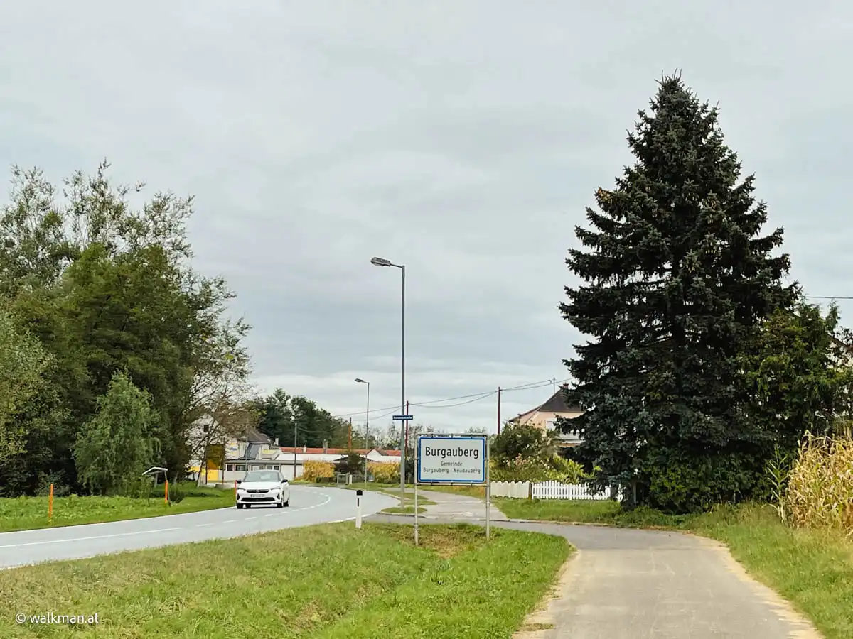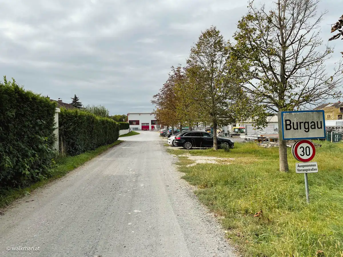 Am nächsten Schotterweg rechts, dann bald wieder links. Und schon wandern wir, am Ortsschild vorbei, nach Burgau hinein. Das ist ja heute richtig flott gegangen. Und auch Manuela hat ihr Tempo durchaus gesteigert, gegenüber unserer letzten Tour. Respekt und Chapeau! „Yes, we can!“