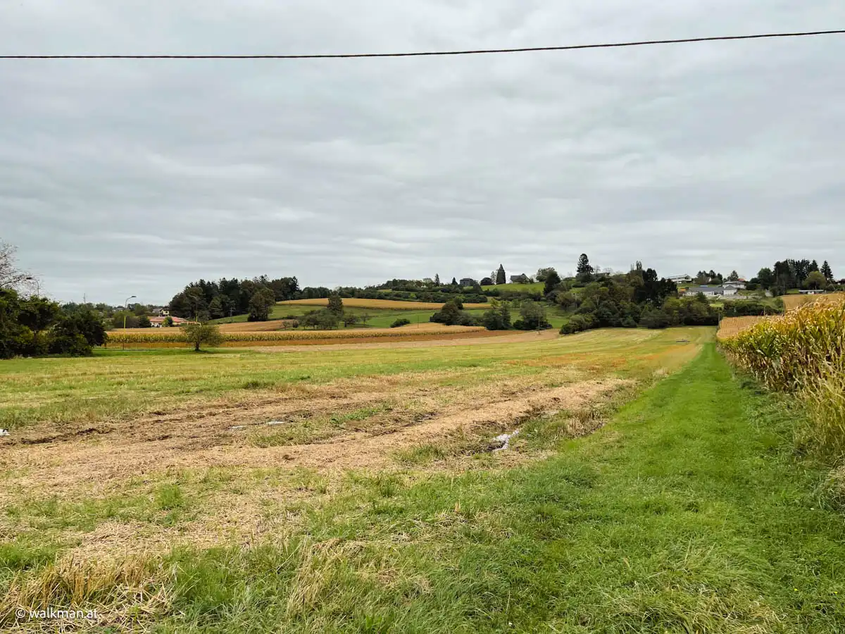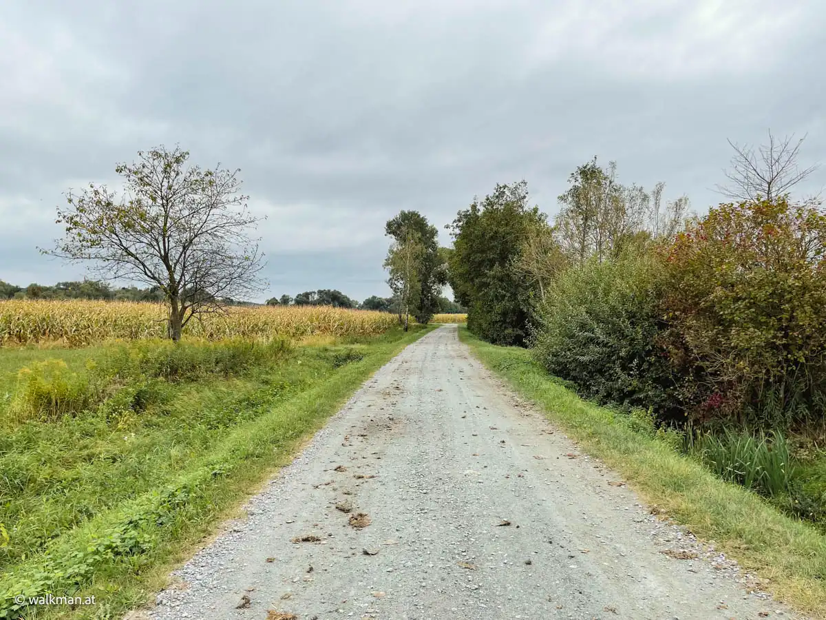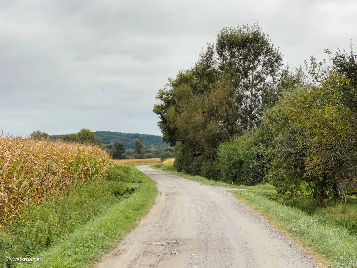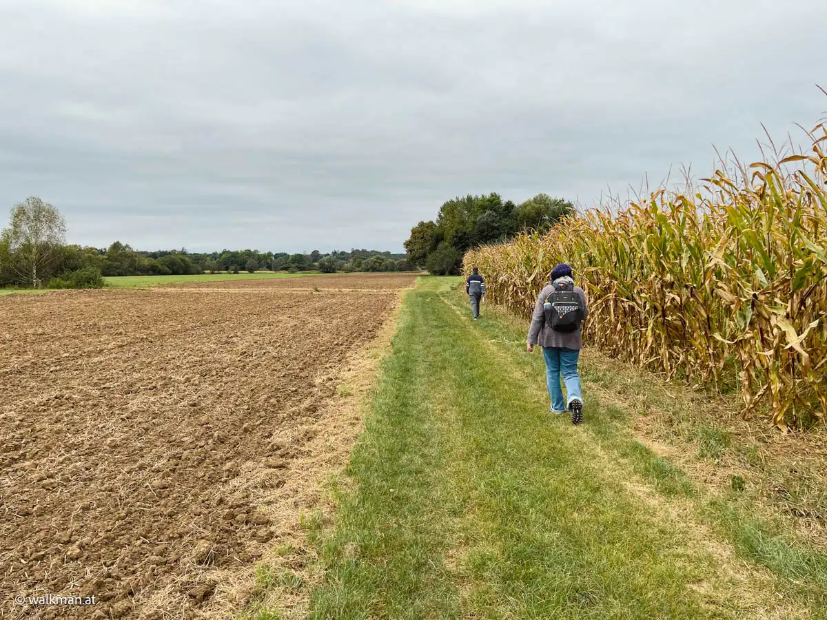 Einige Schlucke aus unseren Wasserflaschen später und frisch erholt marschieren wir weiter. Unser nächstes Ziel ist bereits Burgau. Nach der Tschartake links rein, an einem Maisfeld entlang. So ganz möchte der Mais also auch hier nicht vergessen werden. Macht nichts. Hier ist er uns grade ganz recht. Der Wind hat ein wenig aufgefrischt und das Feld hält ihn nun auf einem kurzen Abschnitt ein wenig ab.