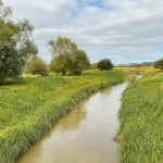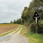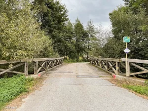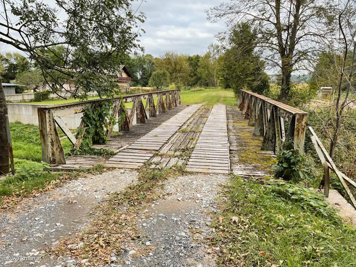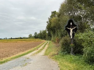 Beim „Loatawagerl“ queren wir die Bundesstraße und wandern die Gasse hinein, über die Lafnitz-Brücke drüber. Gleich nach der Brücke befindet sich ein hölzernes Jesuskreuz auf der rechten Seite. Hier müssen auch wir rechts rein. Den Feldweg Richtung Norden, am Ufer der Lafnitz entlang.