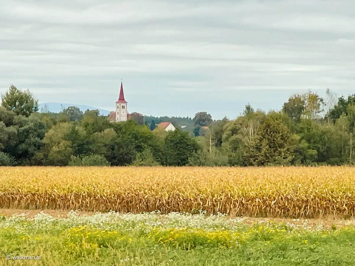 Hier spazieren wir nun gemütlich über das Grenzland, zwischen dem Burgenland und der Steiermark. Seit der Brücke befinden wir uns ja schon in der grünen Mark. Passend dazu präsentiert sich natürlich auch die Gegend. Viele, viele grüne Wiesen. Und mal ausnahmsweise wenig bis kein Mais. Und der Feldweg ist sehr angenehm zu gehen. Feste flache Fahrspuren, ohne „Stolpersteine“.