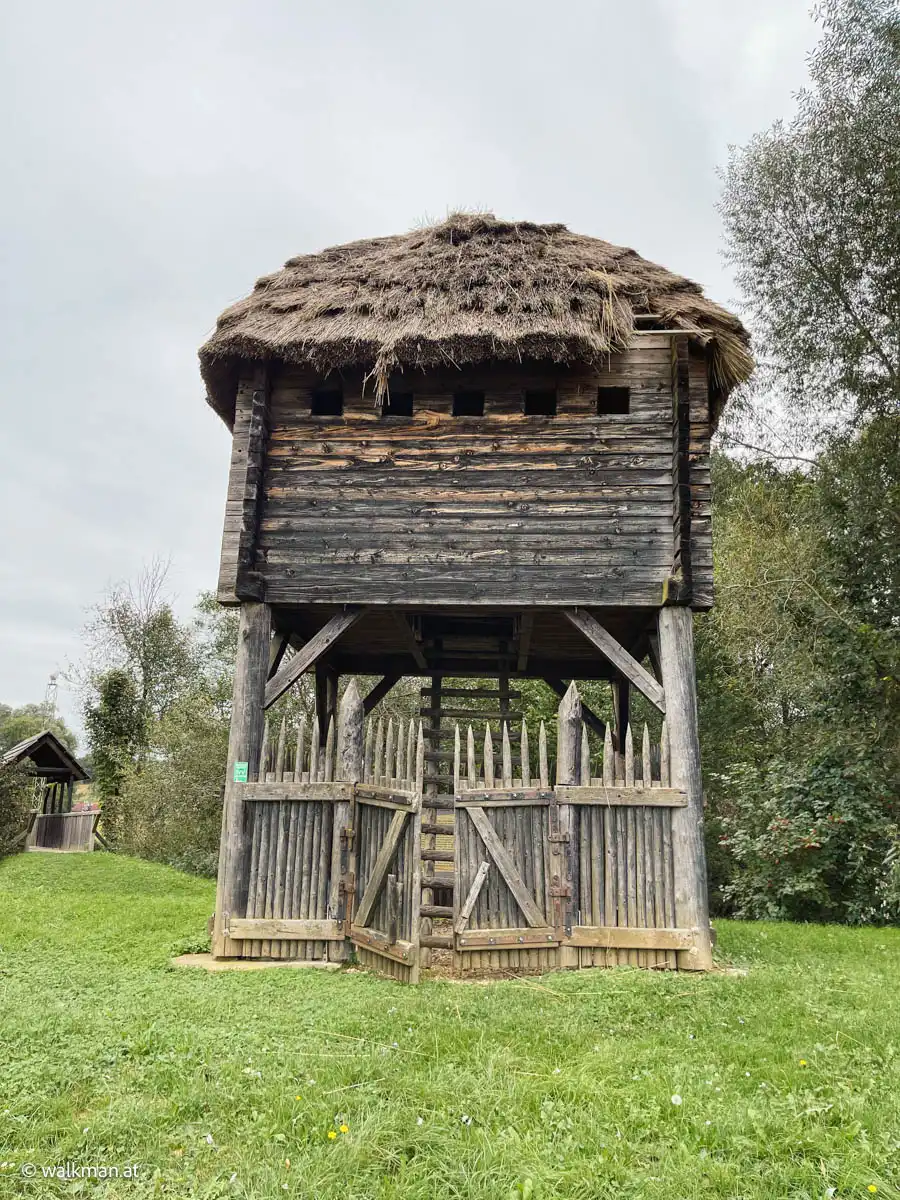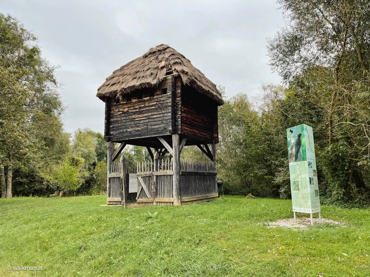 An der Tschartake sind auch Info-Tafeln angebracht, die über Bauweise und Zweck dieser Konstrukte informieren. Und von deren gab es früher offensichtlich einige bis hinunter nach Bad Radkersburg. Eine richtige Verteidigungslinie eben, aus den massiven Pfahlbauten.
