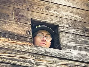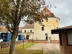 Und „bekraxelbar“. Über die Leiter kann man ja wohl kaum rauf „gehen“. Das probiert Junior natürlich sofort aus. Kurze Zeit später steckt er auch schon sein Gesicht durch einen der Schlitze oben, aus denen früher die Bevölkerung ihre „Schiesseisen“ gegen die Kuruzzen und Osmanen gerichtet hatte. Sein Kopf passt grade mal durch. Sieht witzig aus.