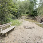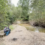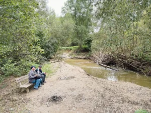 Gleich neben der Tschartake fließt die Lafnitz. An diesem Ort hier beschreibt der Fluss einen Bogen, auf dem eine Sandbank frei liegt. Und auf ebendieser ist eine Bank installiert. Ein wirklich schönes Platzerl zum Rasten. Das nutzen wir und lauschen ein wenig dem Rauschen der Lafnitz. Und blödeln dabei herum. Gefällt uns.