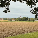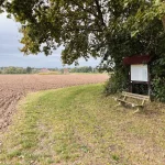 Am Ende des Feldes, bei einer Baumgruppe, biegt der Weg schräg rechts weg. Hier wäre auch eine weitere Bank zum Rasten. Eine Station des „Kuruzzenwanderwegs“. Nutzen wir aber nicht. Wir gehen flott weiter bis zum nächsten Schotterweg, der das Ende des Feldwegs markiert. Hier nun links abbiegen. Die Häuser von Burgau dominieren bereits unsere Aussicht. Es ist nicht mehr weit.