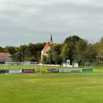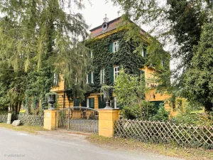 Angekommen an der Hauptstraße biegt unsere Route nun nach rechts weg. Ich hatte noch eine Schleife beim Wasserschloss und dem Strandbad vorbei eingeplant. Soll ja auch was zum Gucken dabei sein. Also die Hauptstraße hinauf und an der ersten Gasse links hinein. Hier steht zwar das Zeichen „Sackgasse“ – gilt aber nicht für Fußgänger. Man erreicht die gegenüberliegende Parallelstraße durch das Camping-Areal hindurch.