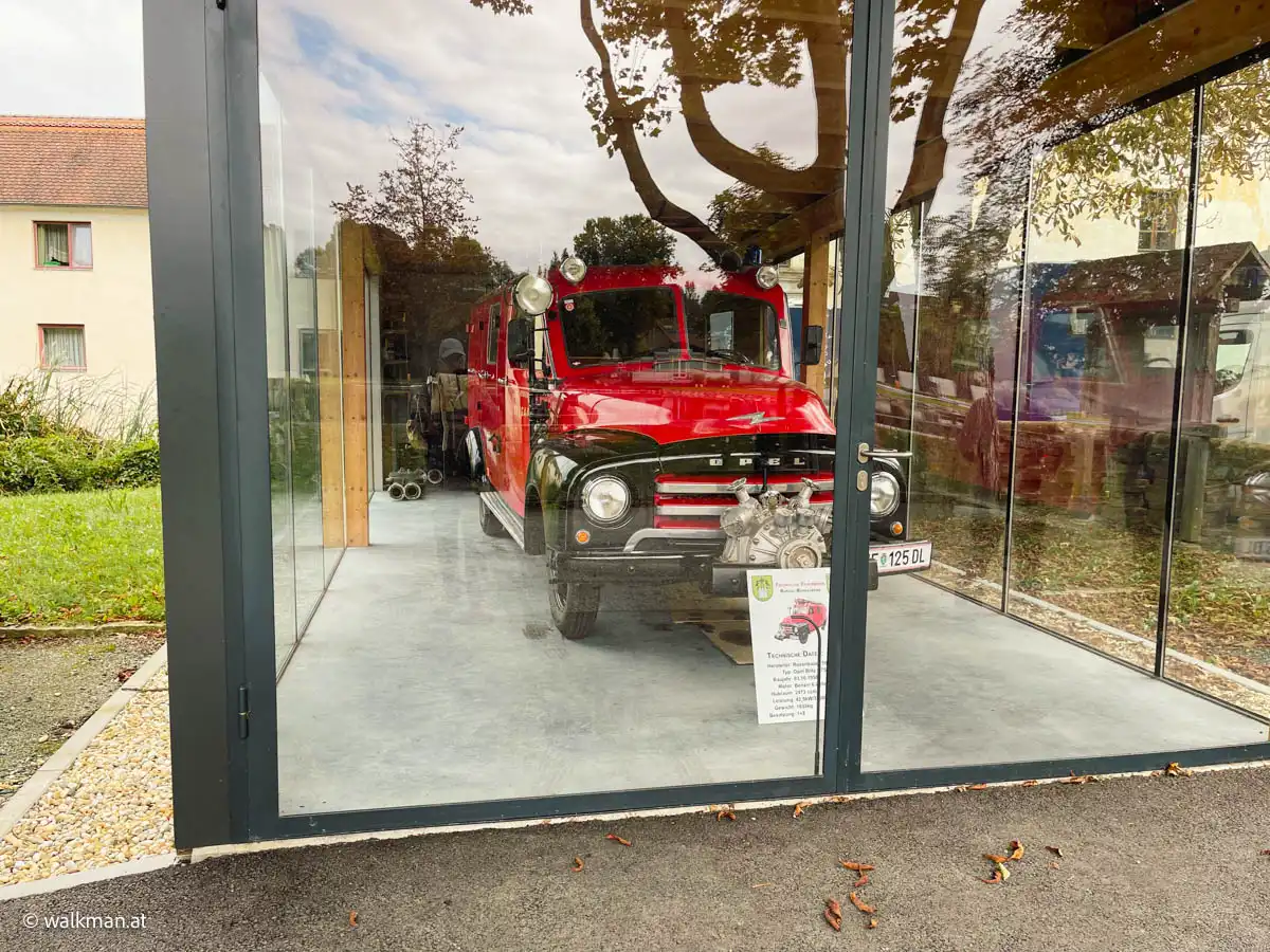 Vorbei am Feuerwehrhaus, mit zwei ganz speziellen Oldtimer-Feuerwehr-Fahrzeugen, die vor dem Gebäude ausgestellt waren. Das war was für unseren Junior, der ja erst kürzlich eine Lehre als Machhiniker, ups, Mechaniker, begonnen hatte. Bin ja selber ein gelernter Machhiniker.