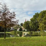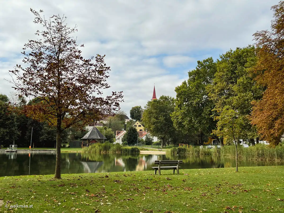 Gleich gegenüber befindet sich das große Areal des Strandbades. Heute, Ende September, ist der Badebetrieb natürlich schon eingestellt, aber die Mischung aus grünem Rasen und Herbstlaub, in Verbindung mit den braun werdenden Bäumen, ergeben eine ganz eigene, romantische Kulisse. Hier möchte ich mal Fotos machen, wenn das Licht auch dazu passt. Bei untergehender Sonne zum Beispiel im Spätherbst. Könnte durchaus spektakulär werden.