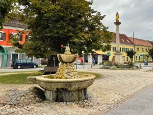 Davor geht es aber noch um den erwähnten Hauptplatz mit Mariensäule und Springbrunnen. Dieser Platz hat sich in den vergangenen Jahren auch gemausert. Schön hergerichtet und immer wieder neu gestaltet. Je nach Saison.