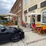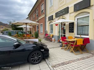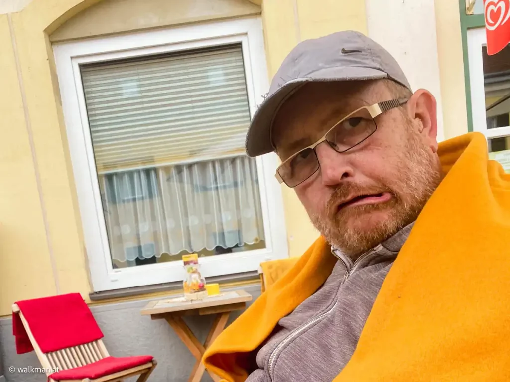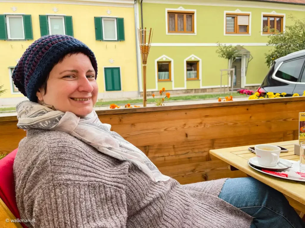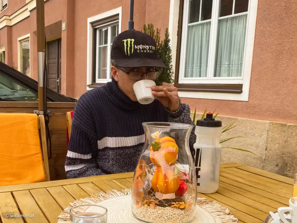 Aber jetzt ist erst mal Pause angesagt. Der einladende, kleine Gastgarten vor dem Café wartet schon auf uns. Bzw. hat gewartet. Wir sitzen schon und bestellen bei dem flink heraus geeilten Kellner. An dieser Stelle sei auch erwähnt, das hier draußen im Herbst immer Decken bereit liegen. Über die Sessel geschwungen zur freien Nutzung.