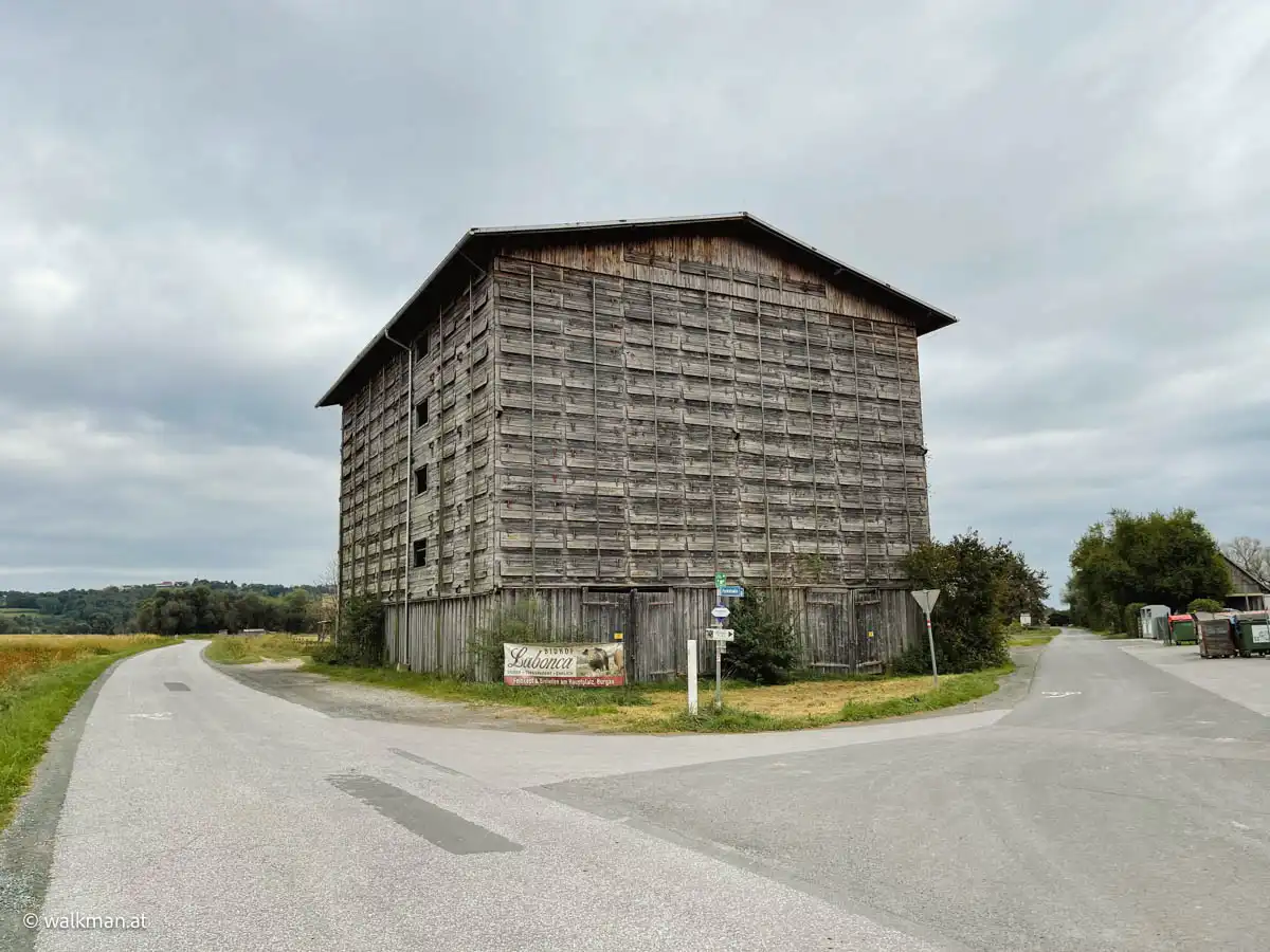 Bei der großen, alten, nicht zu übersehenden Scheune, wo einst Tabak getrocknet wurde, halte ich mich, bei der Straßengabelung, rechts. Auf diesem Güterweg marschiere ich nun flotten Schrittes immer weiter nach Süden. Bis der Weg auf einen querenden Feldweg trifft, der mich direkt zurück nach Rohrbrunn führen soll.