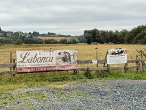 Einziges Highlight auf diesem Abschnitt ist gleich zu Beginn, bei der Tabakscheune, das Areal, wo die Firma „La Bonca“, ihre „Sonnenschweine“ in weitläufigen Gattern hält. Helle, dunkle, große, kleine – von jeder Sorte findet hier das Auge ein Exemplar. Und sie fühlen sich sichtlich wohl auf der großen natürlichen „Spielwiese“ samt Suhlen und Unterstand.
