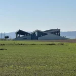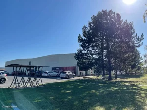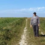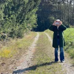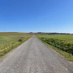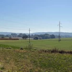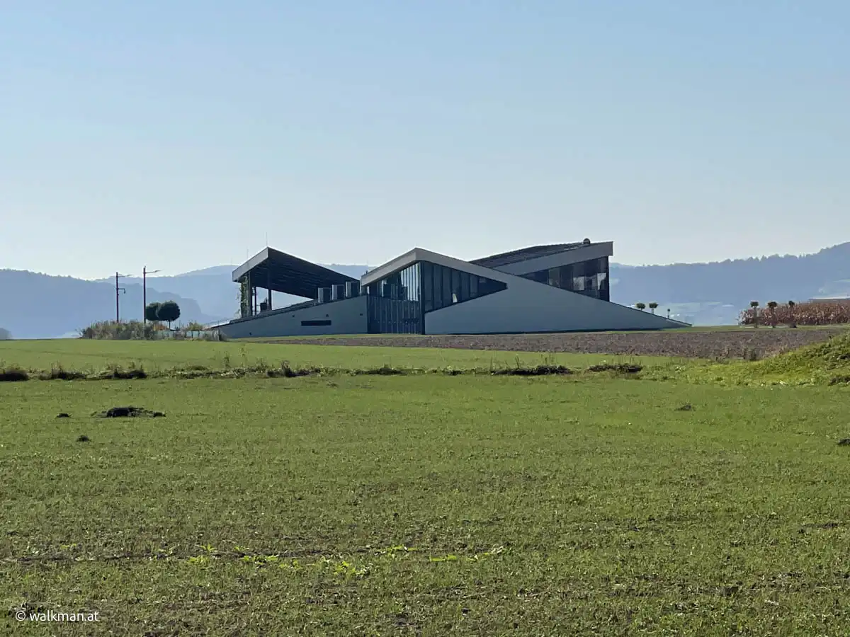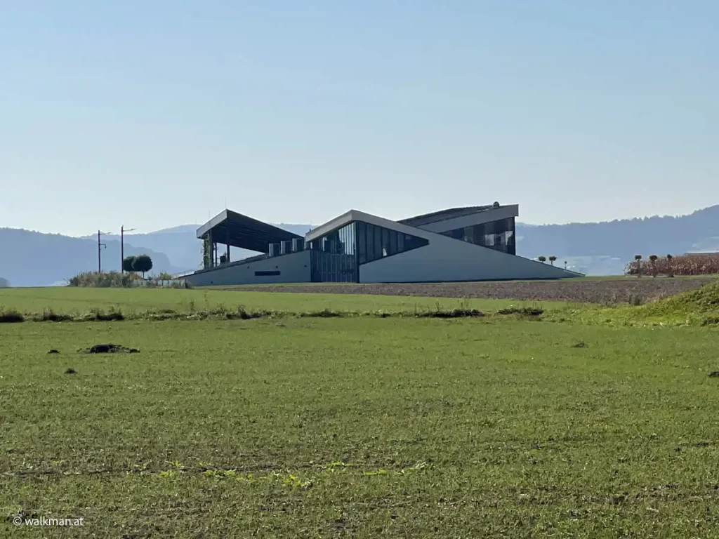 Aber heute marschieren wir nur vorbei und schießen ein paar Fotos. Unser Weg führt aber geradeaus weiter. In den Feldweg hinein am Ende der Straße. Hier erblicken wir rechts, Richtung Süden, in einiger Entfernung, auch ein seltsam aussehendes Gebäude, mit zwei, nach innen geneigten, Schrägdächern. Ein nachträgliches Recherchieren im Web, sagt uns, dabei handelt es sich um die „Solar-World“. Eine Firma, die sich auf Solarversorgung spezialisiert hat. Innovativ.
