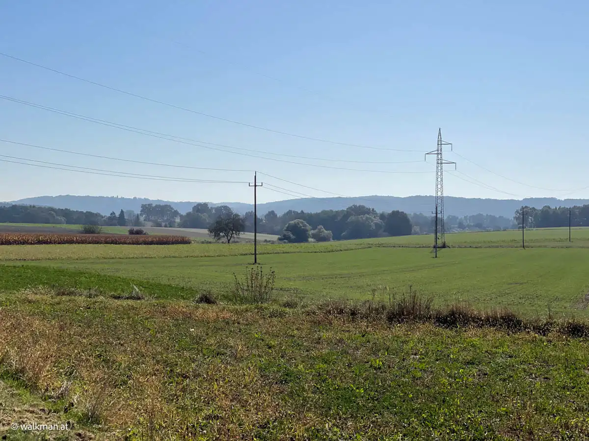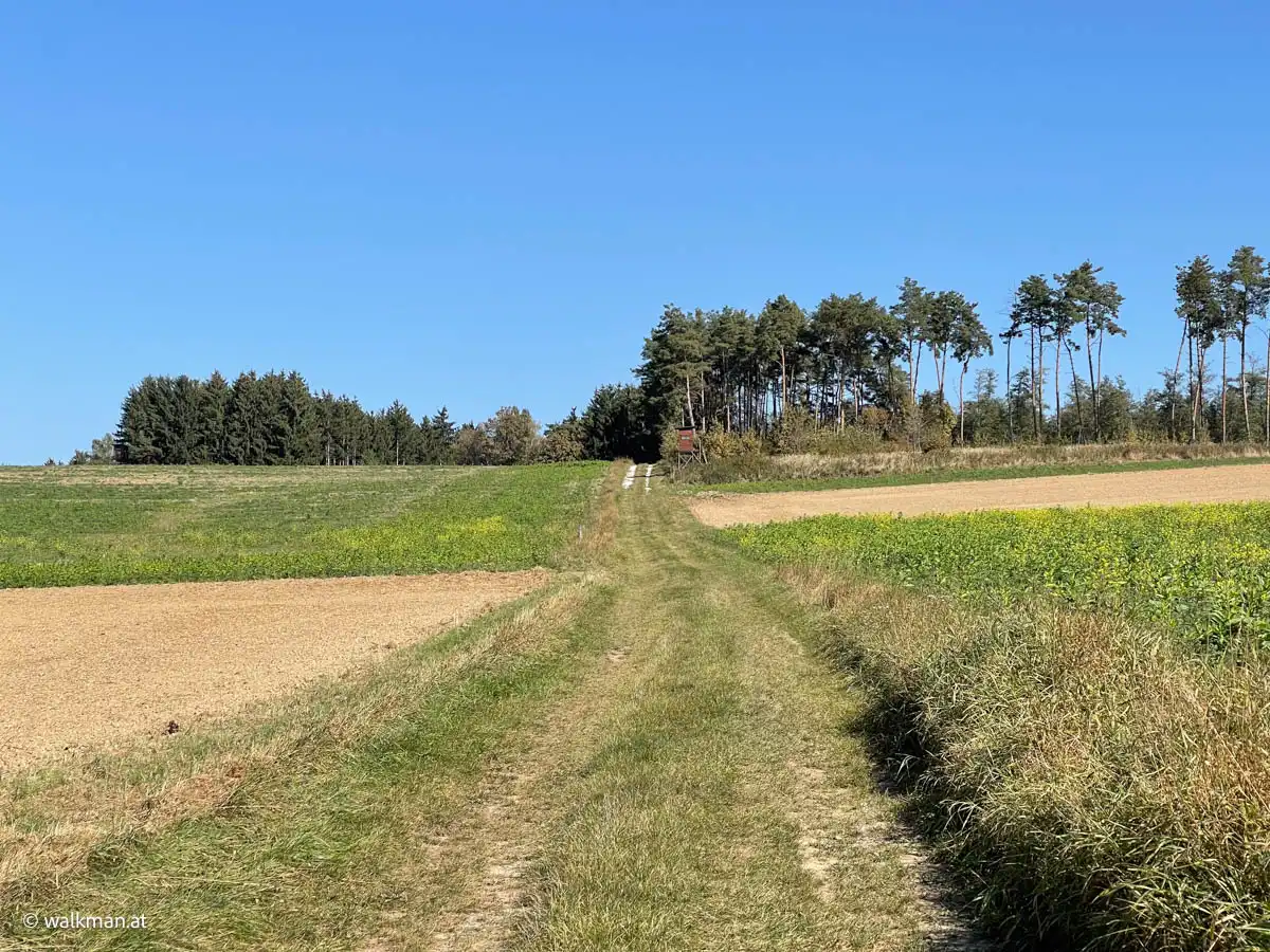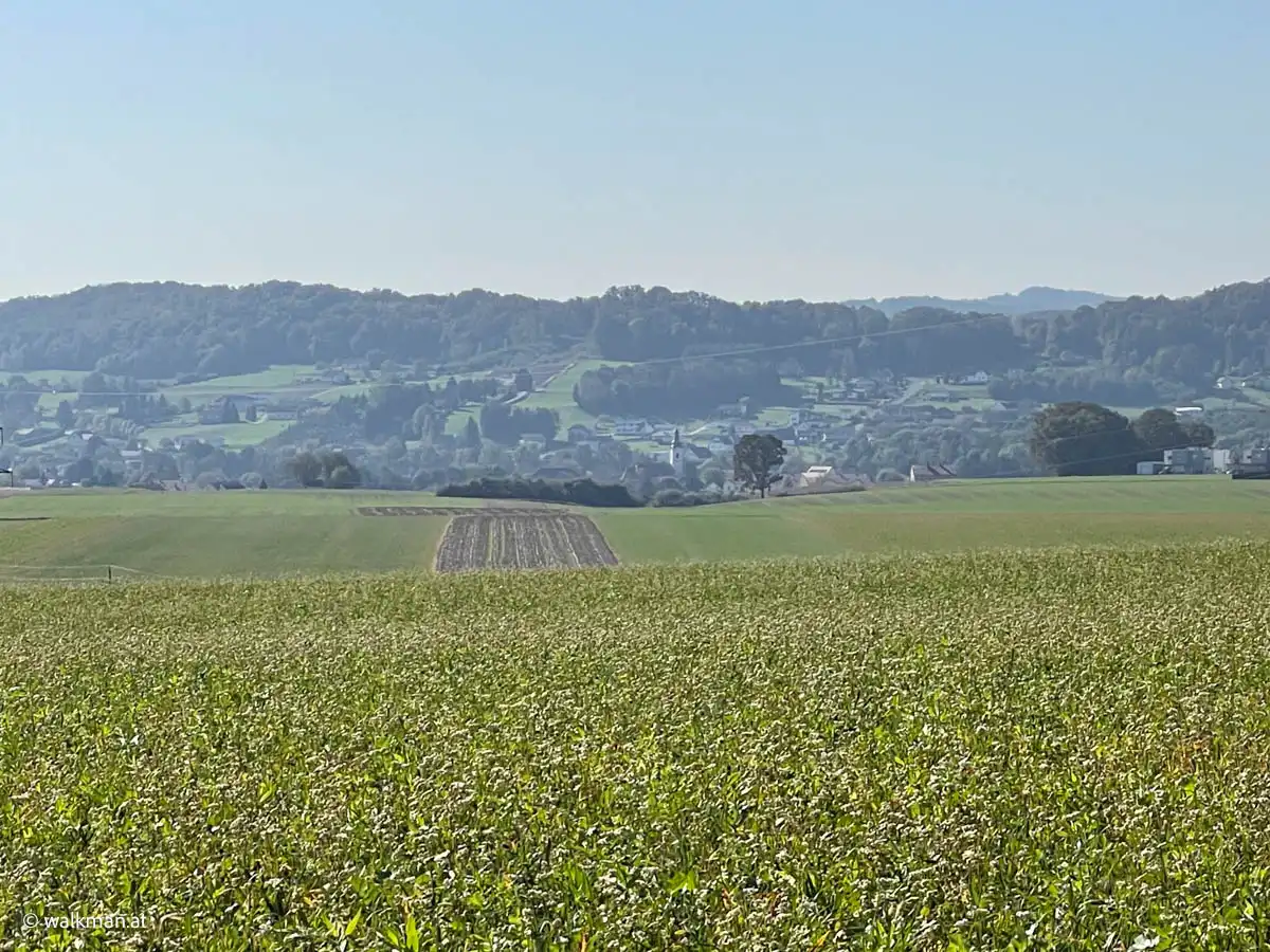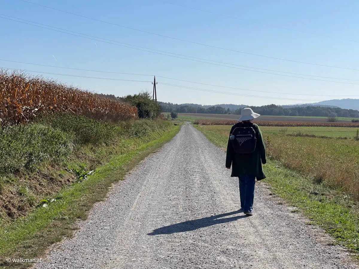 Vorbei an noch nicht geernteten Maisfeldern, an ein paar Hochsitzen und weiteren dreissig Höhenmetern zu unseren bereits zuvor gegangenen vierzig, kommen wir dann bei, in Summe siebzig Höhenmetern, zu dem Feldweg zurück. Am höchsten Punkt unserer Tour mit schönem Panoramablick, hinunter auf Stegersbach, Bocksdorf und das Stremtal. Das Einzige, was hier nun fehlt, ist eine Bank.