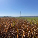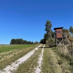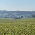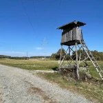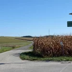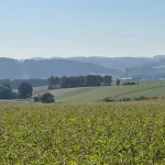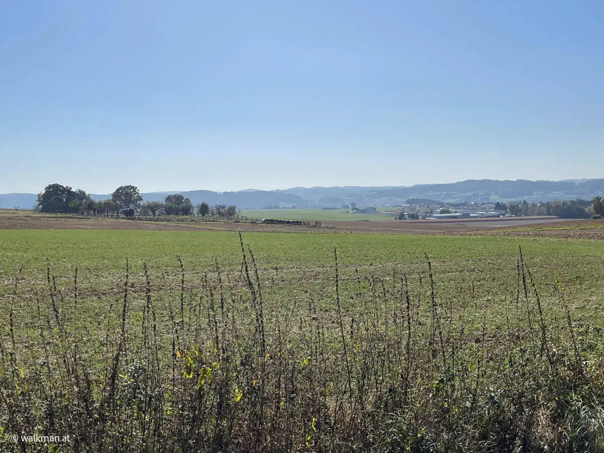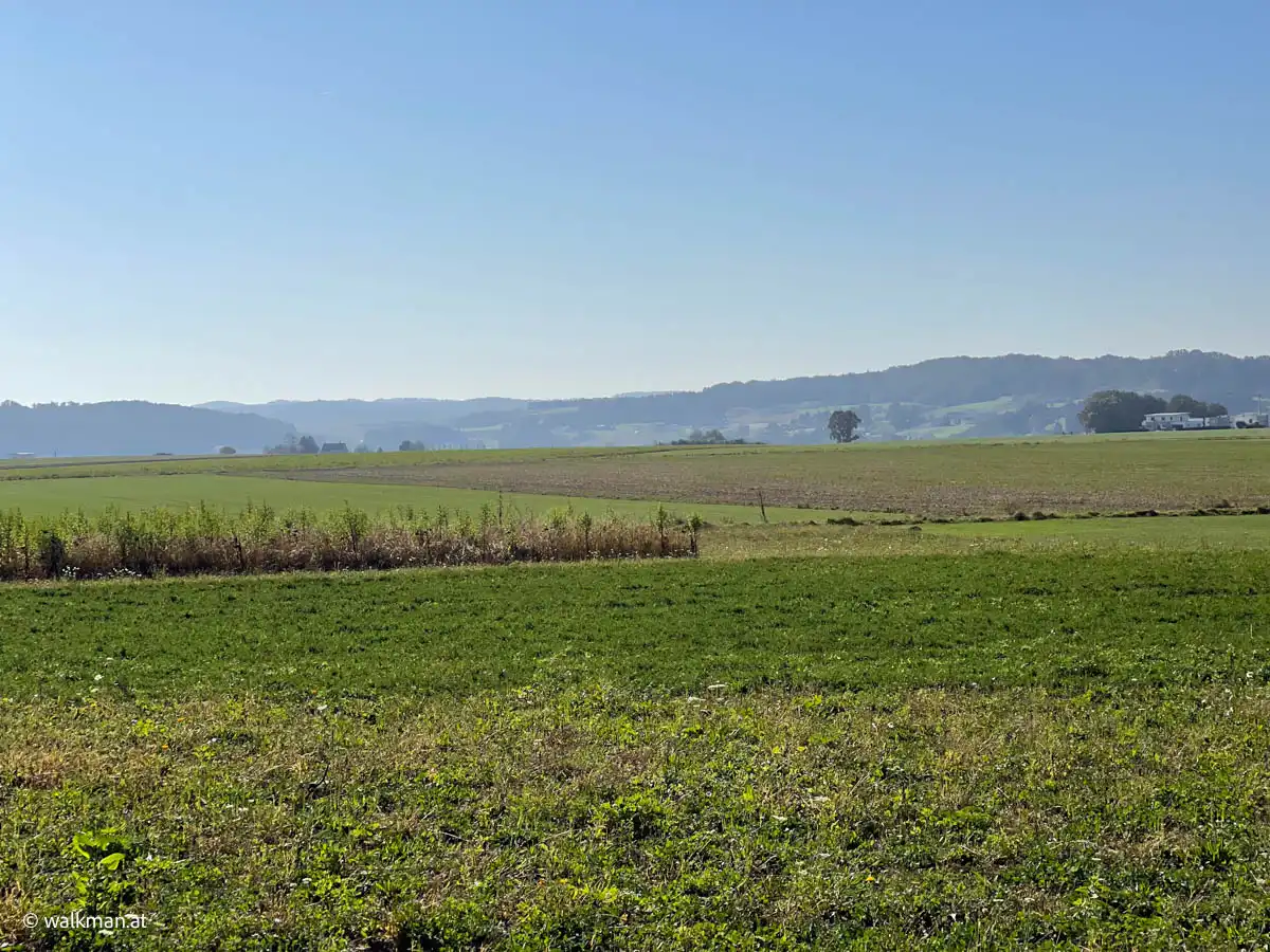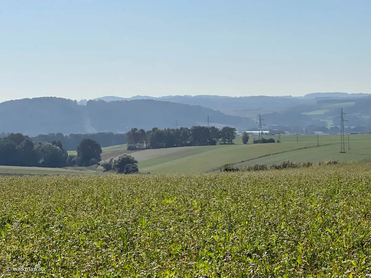 Vorbei an noch nicht geernteten Maisfeldern, an ein paar Hochsitzen und weiteren dreissig Höhenmetern zu unseren bereits zuvor gegangenen vierzig, kommen wir dann bei, in Summe siebzig Höhenmetern, zu dem Feldweg zurück. Am höchsten Punkt unserer Tour mit schönem Panoramablick, hinunter auf Stegersbach, Bocksdorf und das Stremtal. Das Einzige, was hier nun fehlt, ist eine Bank.