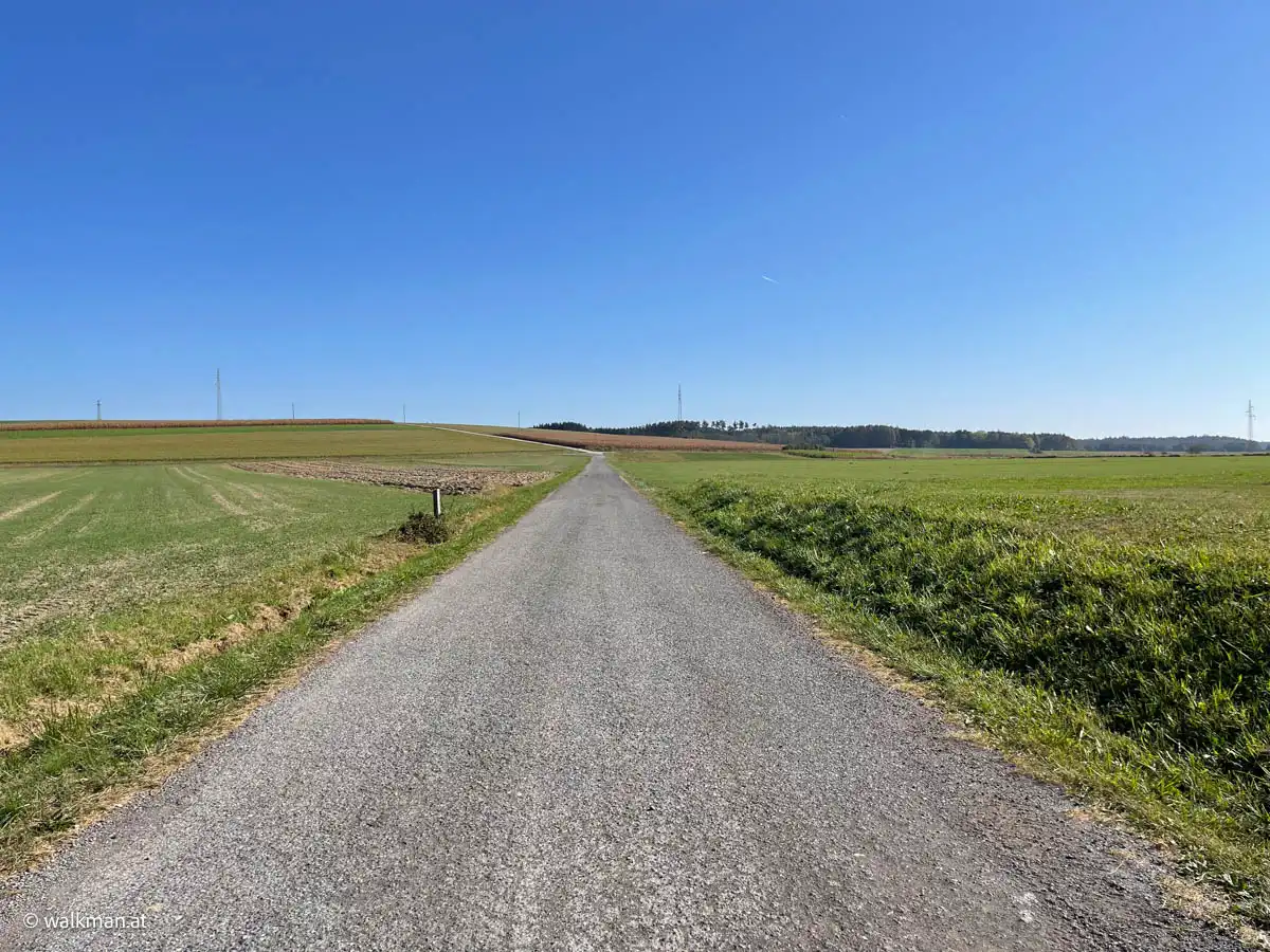 Bei der ersten Gabelung des Feldweges halten wir uns rechts. Wir hätten auch geradeaus marschieren können, aber meine Routenplanung sah auch eine Strecke am Waldrand vor. Und diese führt hier rechts weg, über zwei Linksabbieger, oben wieder auf diesen Weg zurück.
