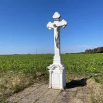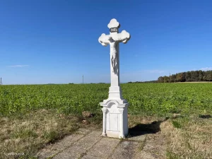 Bald sind wir dann auch auf einem flachen Feldweg, bei der Bundesstraße und dem weißen Kreuz angelangt. Das steht hier, einsam und verlassen. Selten bis nie erwähnt und keinem Wanderweg zugehörig. Aber es scheint vor nicht allzu langer Zeit neu gestrichen worden zu sein. Immerhin. Ein paar Fotos und weiter geht’s.
