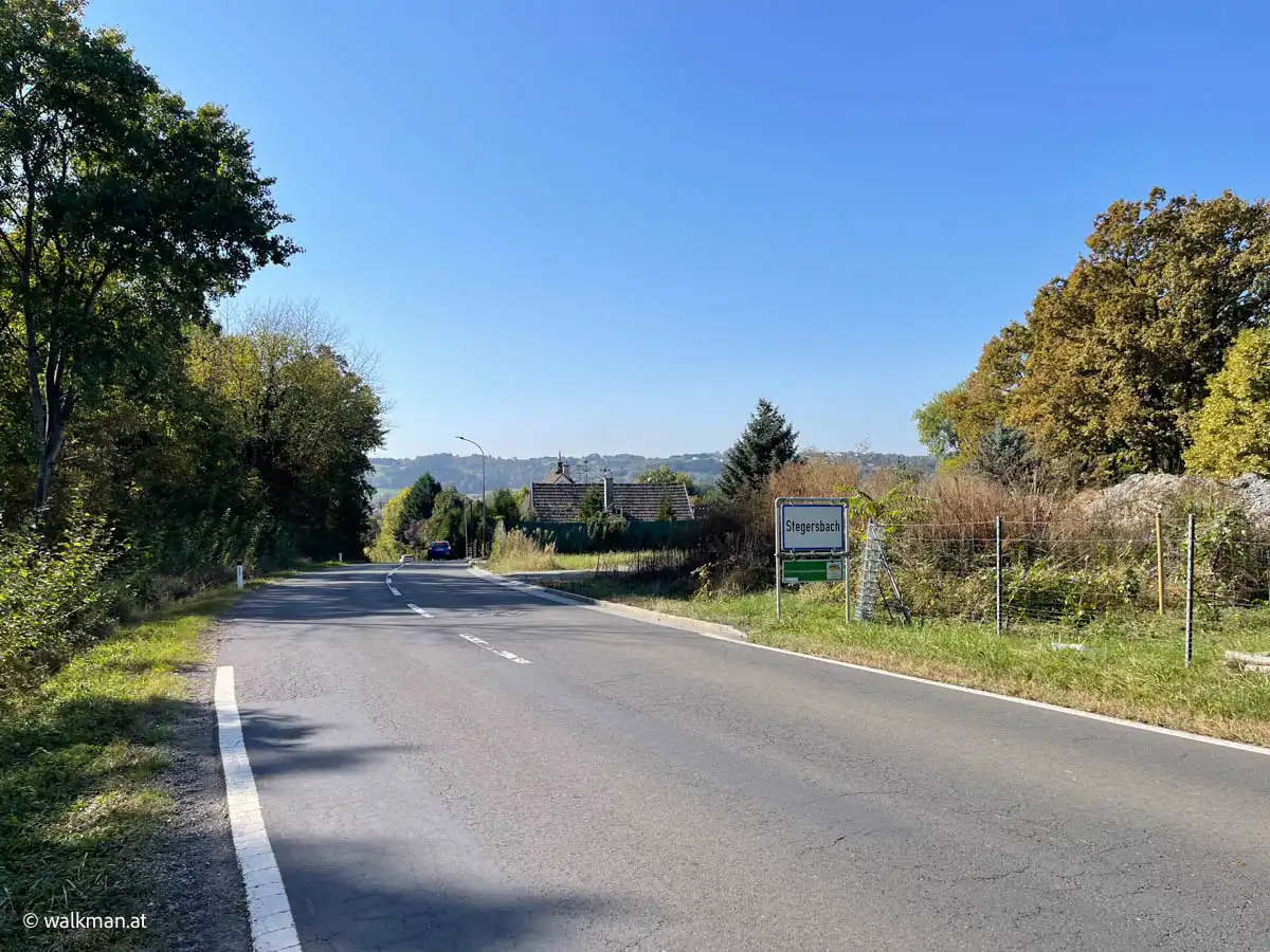 An der Ortstafel von Stegersbach vorbei marschieren wir nun wieder in den Ort hinein. Auf der Olbendorfer Straße, oder wie sie innerorts heißt: Schoaderstraße. Vorbei am hochliegenden Trinkwasserbehälter, der Stegersbach mit seinem kostbaren Nass versorgt, stetig bergab.