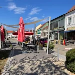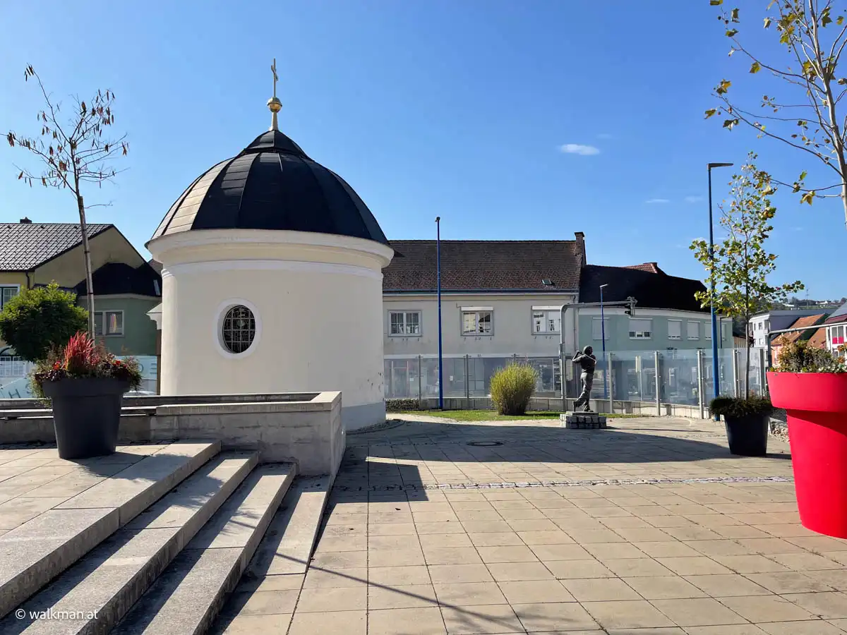 Beim Hauptplatz angekommen, halte ich mich links, marschiere über den Hauptplatz drüber. Vorbei an der Golf-Statue und der Kapelle. Durch den Schanigarten vom Kunst-Café hindurch. Hier waren wir erst vor zwei Tagen zusammen gewesen. War nett und unterhaltsam.