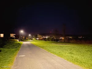 Ein Blick auf meine Uhr sagt mir: Etwa 20:45. Von der Geisterstunde noch weit entfernt, aber außer Fledermäusen ist heute keine Menschenseele zu sehen. Macht aber auch nichts. Mit Blick auf einen Teil von Güssing hinunter erreiche ich, leicht bergab wandernd, die Talstation. Nun gehts wieder auf Asphalt weiter. Und jetzt gehts ans Eingemachte.