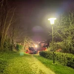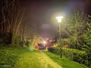 Zunächst verläuft mein Walk angenehm flach am Rand des Fischteichs entlang. Zu sehen ist er in der Dunkelheit allerdings nicht. Einzig ein Quackkonzert von Fröschen lässt auf seine unmittelbare Nähe rückschliessen. Der Weg selbst ist aber, wie erwartet, mit Laternen schön beleuchtet und problemlos zu begehen.