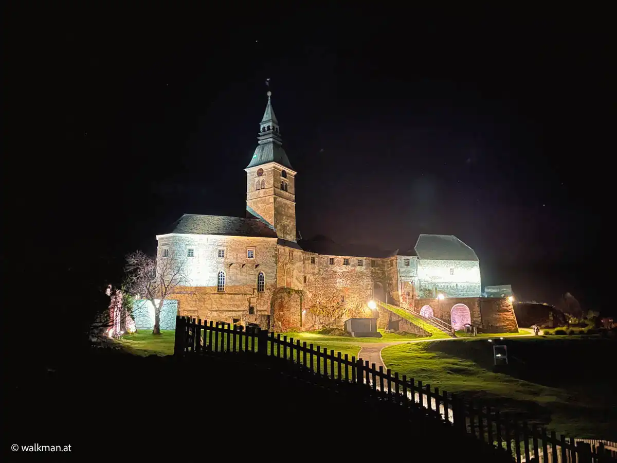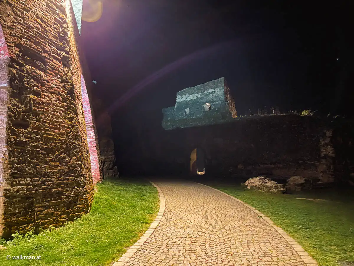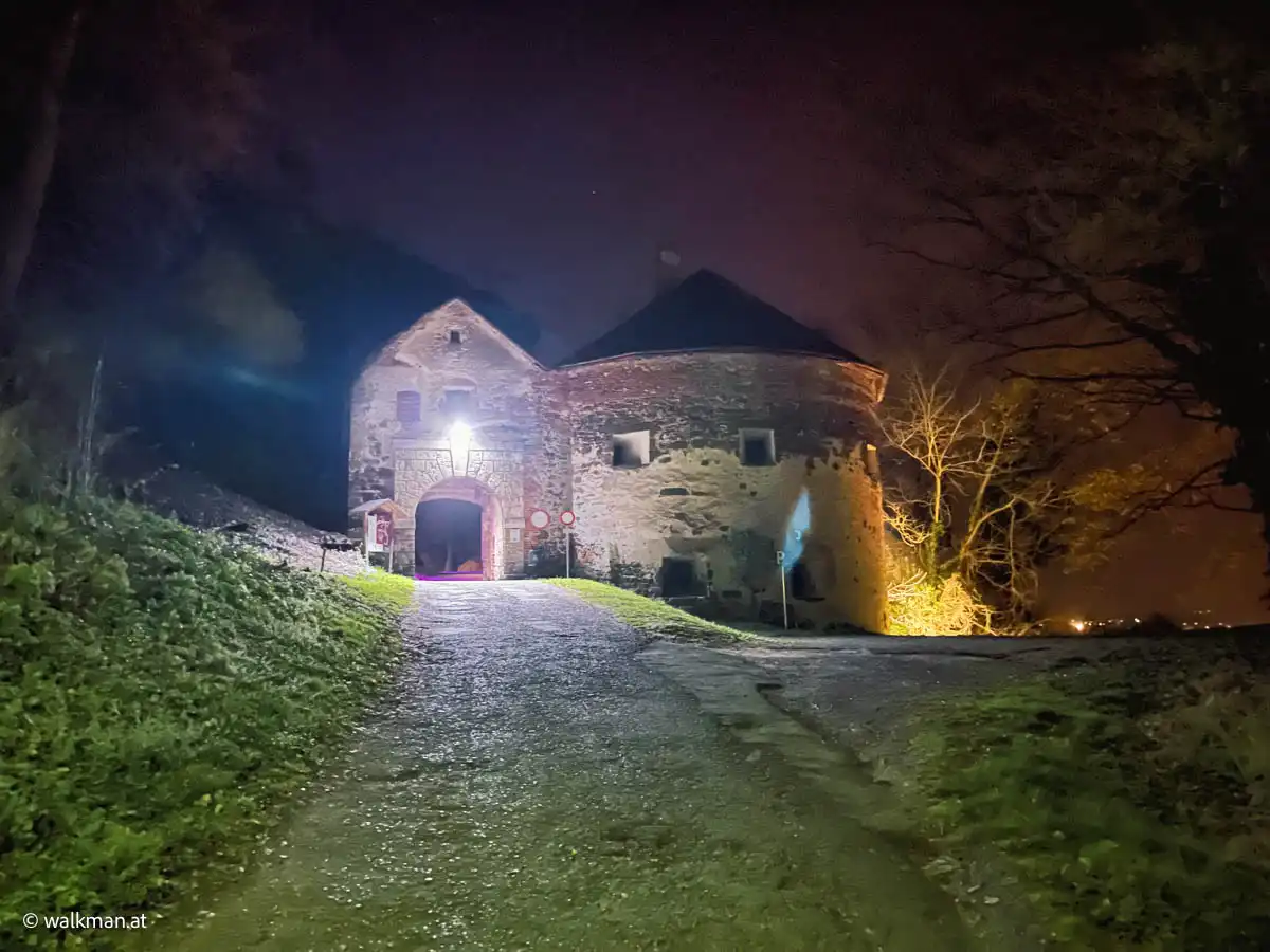 Nach ca. 2,15 Kilometern trete ich durch das letzte Tor hindurch und bin am Burgareal heroben angekommen. Verschwitzt. Aus der Puste. Aber stolz. Und ganz alleine. Keine Menschenseele. Vor mir erhebt sich stolz die beleuchtete Burg. Ja, das hat was. Gefällt mir.