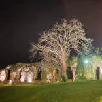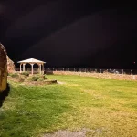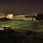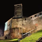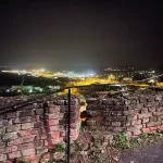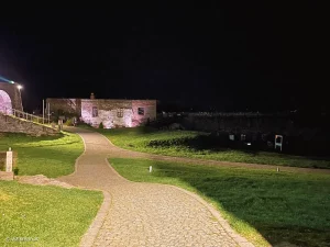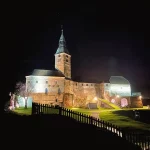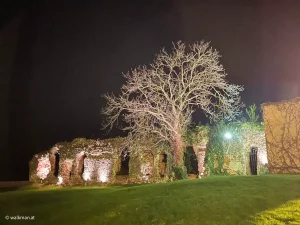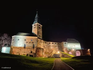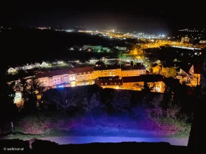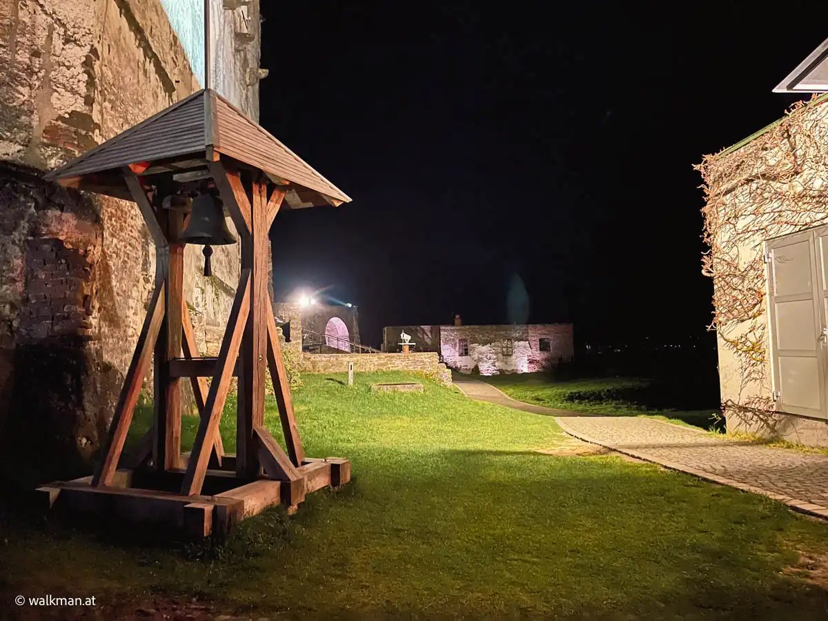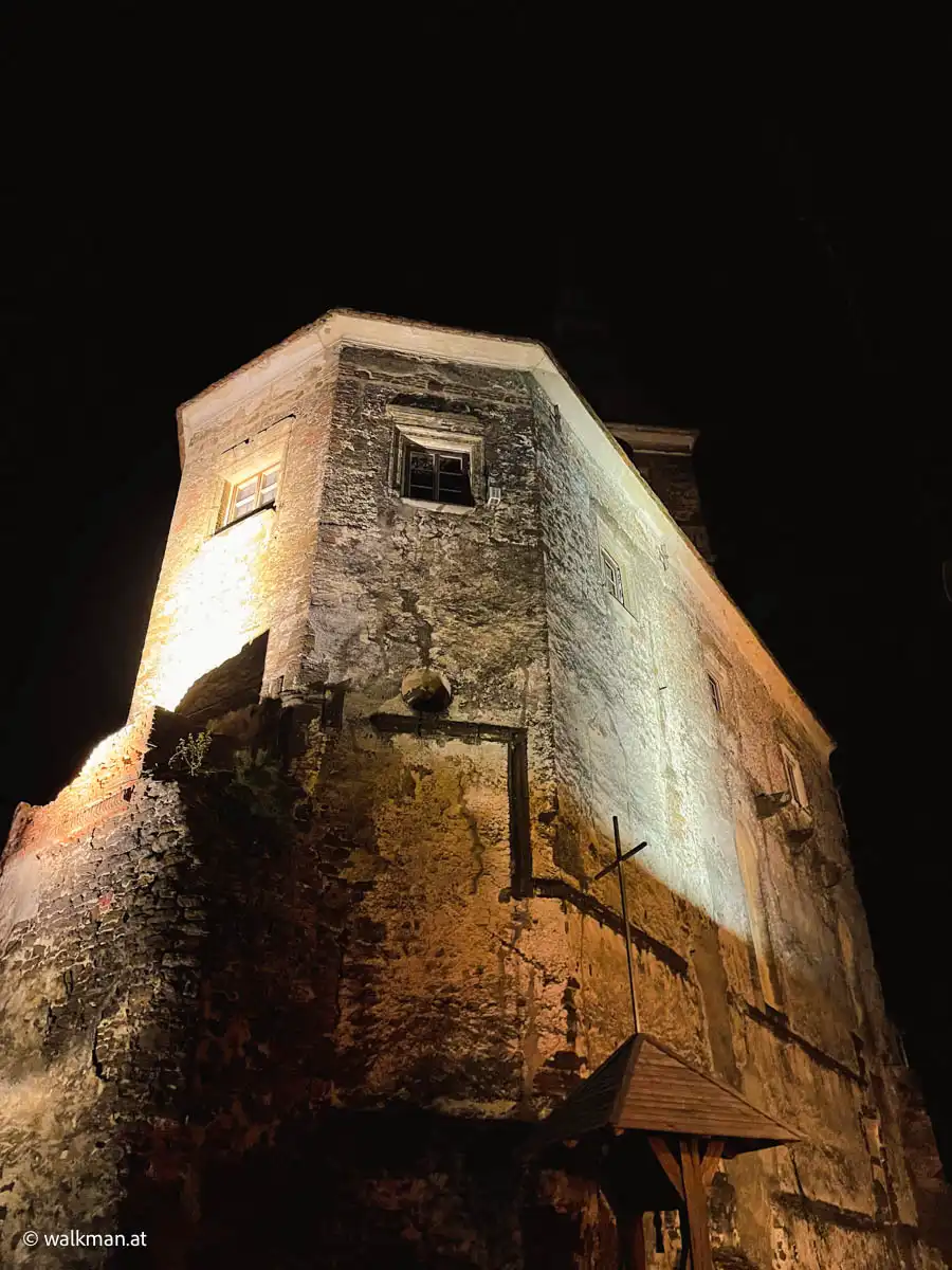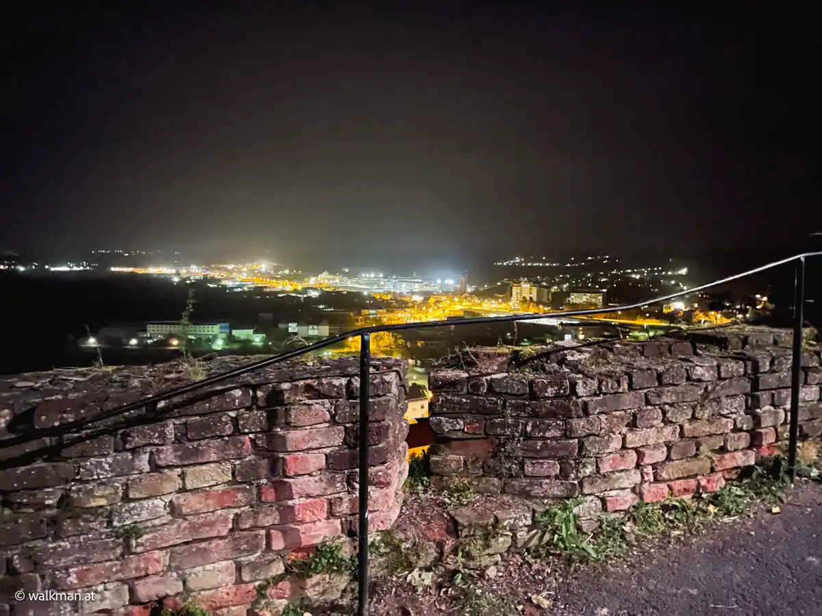 Nach ca. 2,15 Kilometern trete ich durch das letzte Tor hindurch und bin am Burgareal heroben angekommen. Verschwitzt. Aus der Puste. Aber stolz. Und ganz alleine. Keine Menschenseele. Vor mir erhebt sich stolz die beleuchtete Burg. Ja, das hat was. Gefällt mir.
