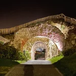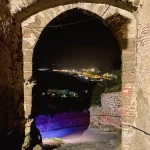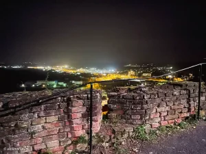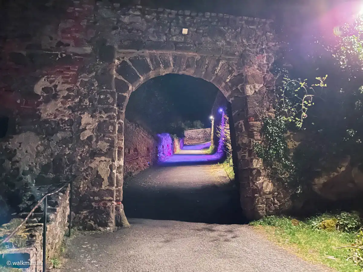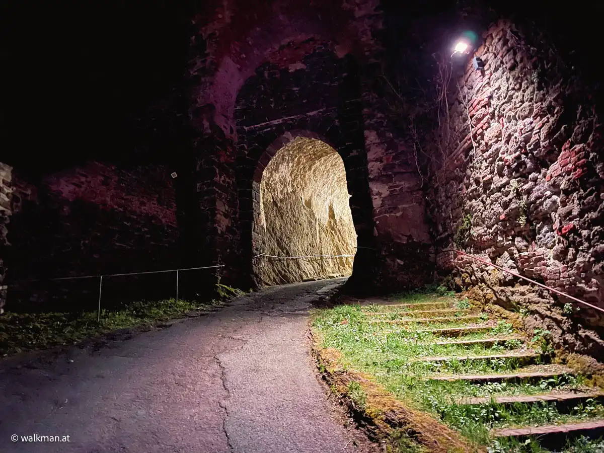 Die „Königsetappe“ dieser kurzen Tour liegt vor mir: Der Burgaufgang. Und dieser fackelt nicht lange herum. Vom ersten Schritt an möchte er an der Steigung erkannt werden. Und am Puls respektiert werden, der bei mir nun schnell ansteigt. Rechts sehe ich die Lichter von Güssing unter mir. Links die Burgmauer. Vor mir das erste Tor, bzw. der erste Durchgang.