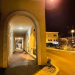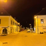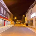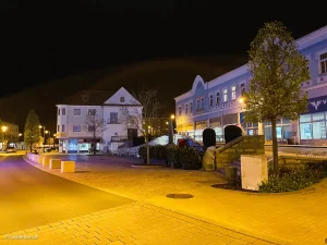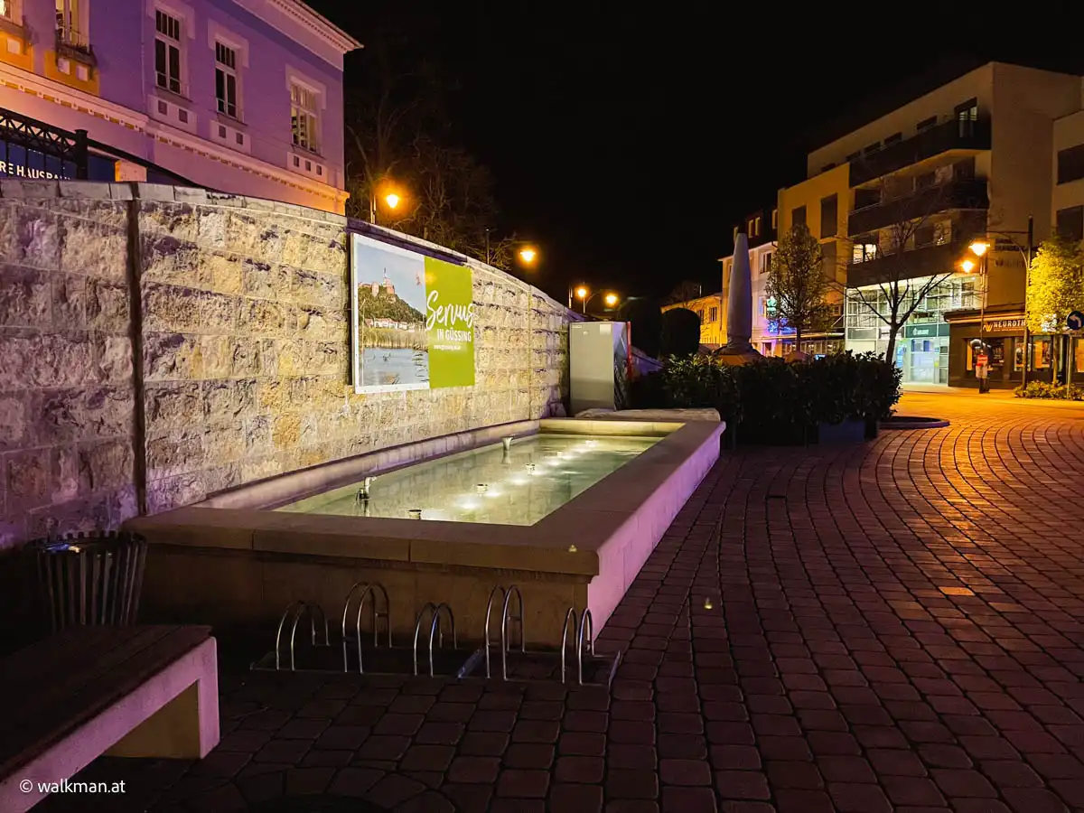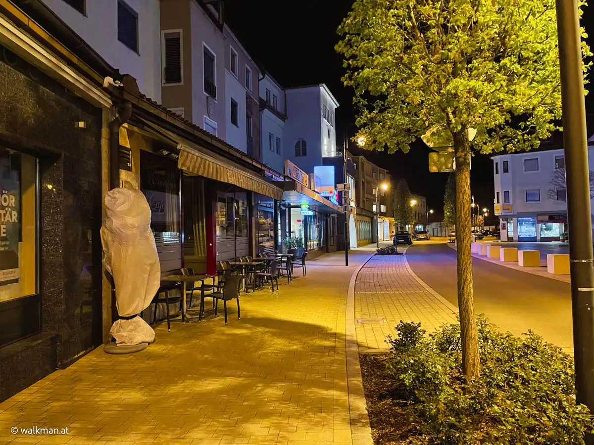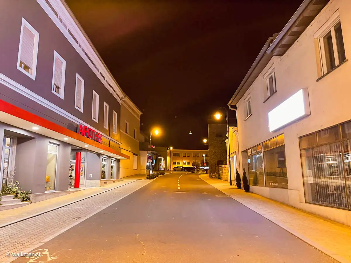 Schnell war ich wieder am Weg und durch das erste Tor Richtung Güssing City unterwegs. Bald durch das zweite, dritte … und ziemlich schnell sah ich schon die erste beleuchtete Gasse in die Stadt. Wo ich mich, an der Kreuzung bei der Talstation der Bahn, hinauf links gehalten hatte, hielt ich mich nun abermals links, Richtung Stadt.