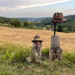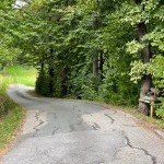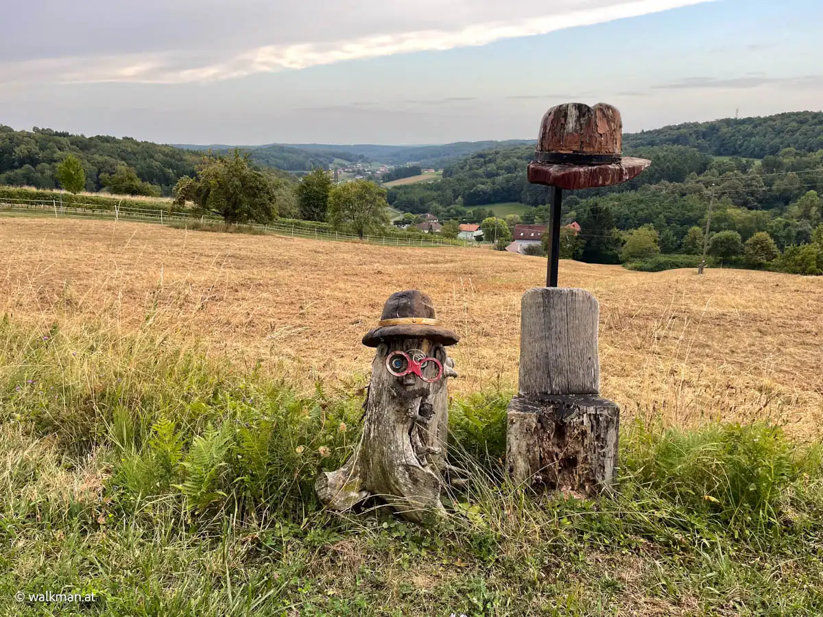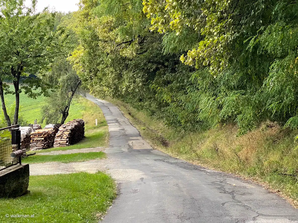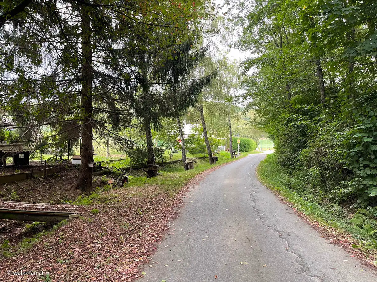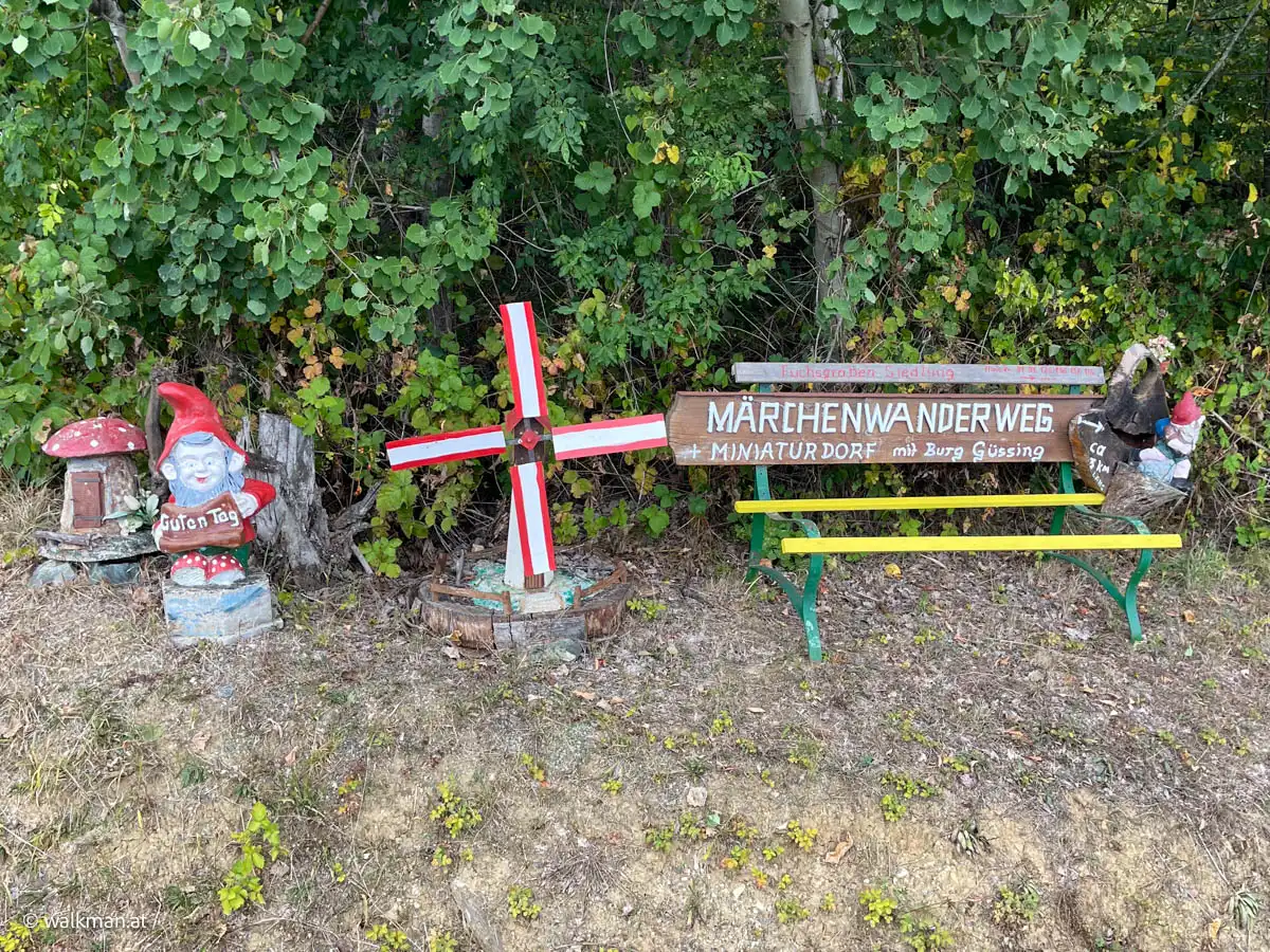 Nun führt der Weg, zunächst ein wenig bergab, um danach gleich wieder anzusteigen. Hier findet man am Straßenrand auch die letzten Märchenstationen dieser Tour. Angekommen auf der Landesstraße oben nach links abbiegen und auf der linken Straßenseite, etwa 800 Meter, wieder zum Startplatz retour. Hier ist kein Gehsteig oder Radweg vorhanden, aber die Straßenführung ziemlich gerade mit relativ wenig Verkehr. Unterm Strich weitgehend ungefährlich.