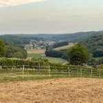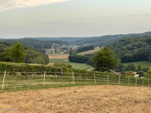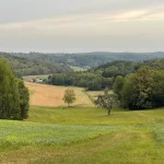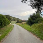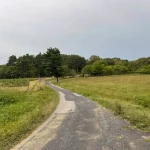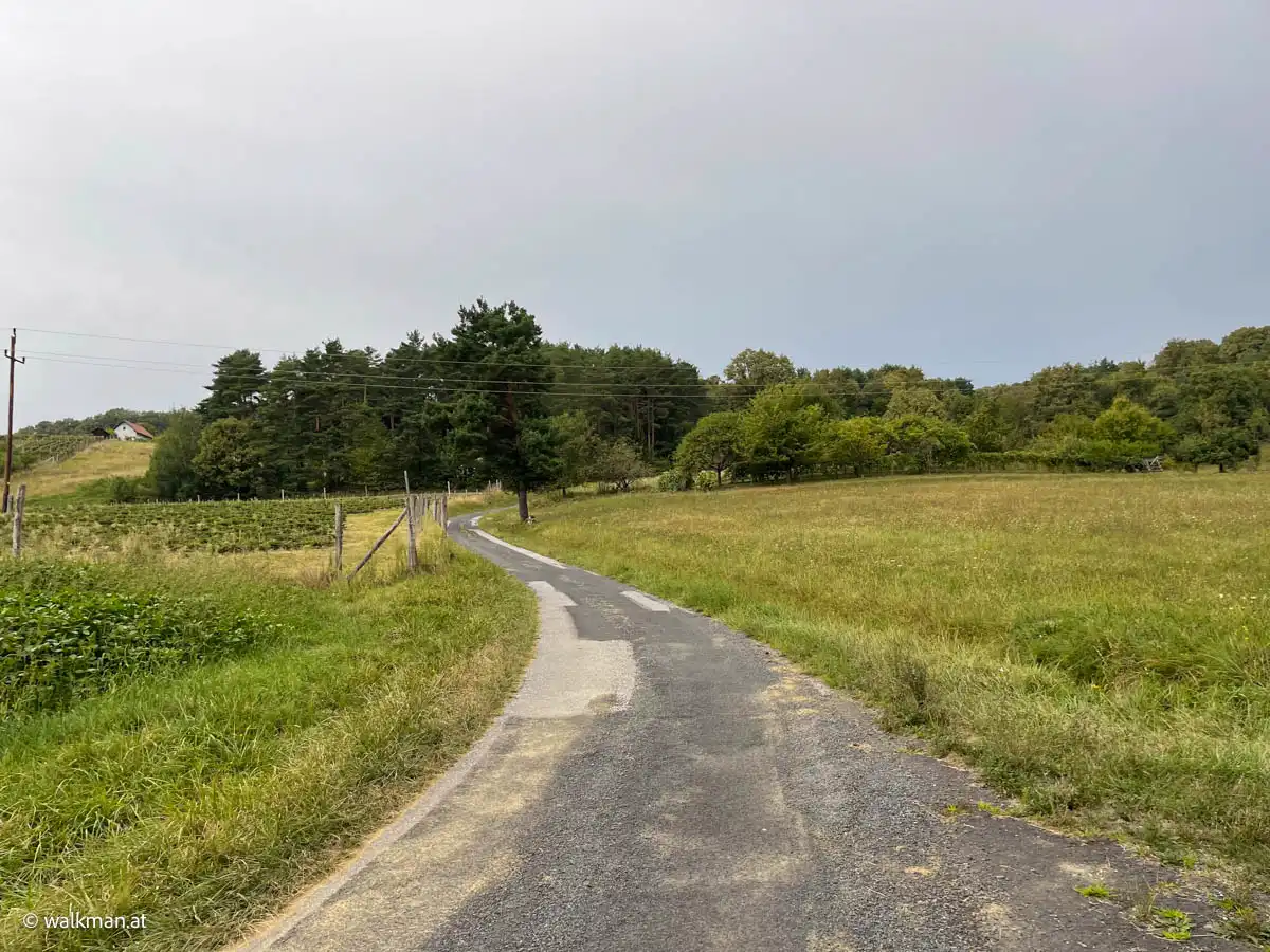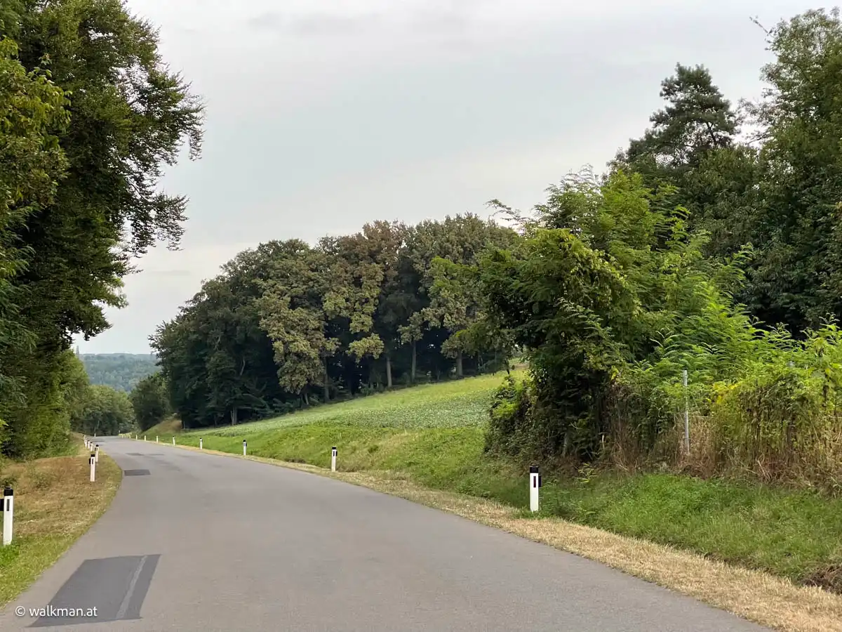 Die Route führt hier nun, entlang der Straße, weiter über den Hügelkamm, bis man bei Kilometer 1,35 wieder nach links abbiegt. Hier ist auch eine Bank zum Rasten vorhanden.