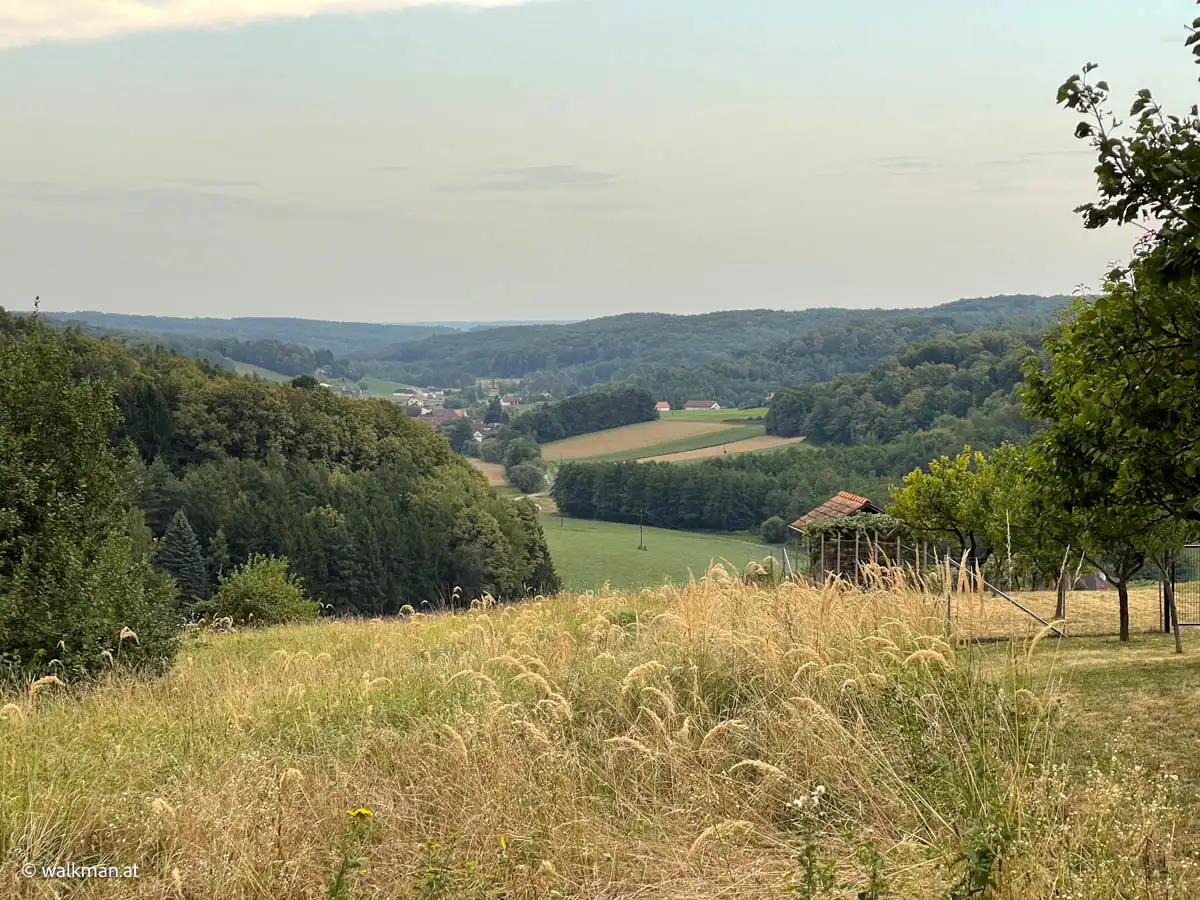 Insgesamt sind dann, vom Tal bis bis zum höchsten Punkt, kurz nach Kilometer 2,0, etwa 80 Höhenmeter zu bewältigen. Hier heroben besteht auch eine Möglichkeit zur Rast. An dem eigens dafür eingerichteten „Rastplatz Schabhüttl Fuchsberg“. Schattig, unter ein paar Bäumen gelegen, ist eine Pause, auch an heißen Tagen, richtig angenehm.