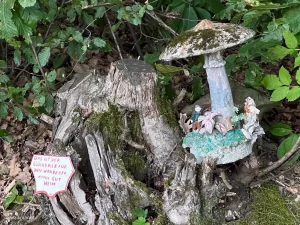 Nachdem diese erste Hürde genommen war, starteten wir unsere Tour. Gleich zu Beginn ist ein nettes Arrangement installiert, dass eindeutig auf den Märchenwanderweg hinweist. Quasi nicht zu übersehen. Mit einer Richtungs- und Entfernungsangabe. Also folgten wir brav dem Pfeil.
